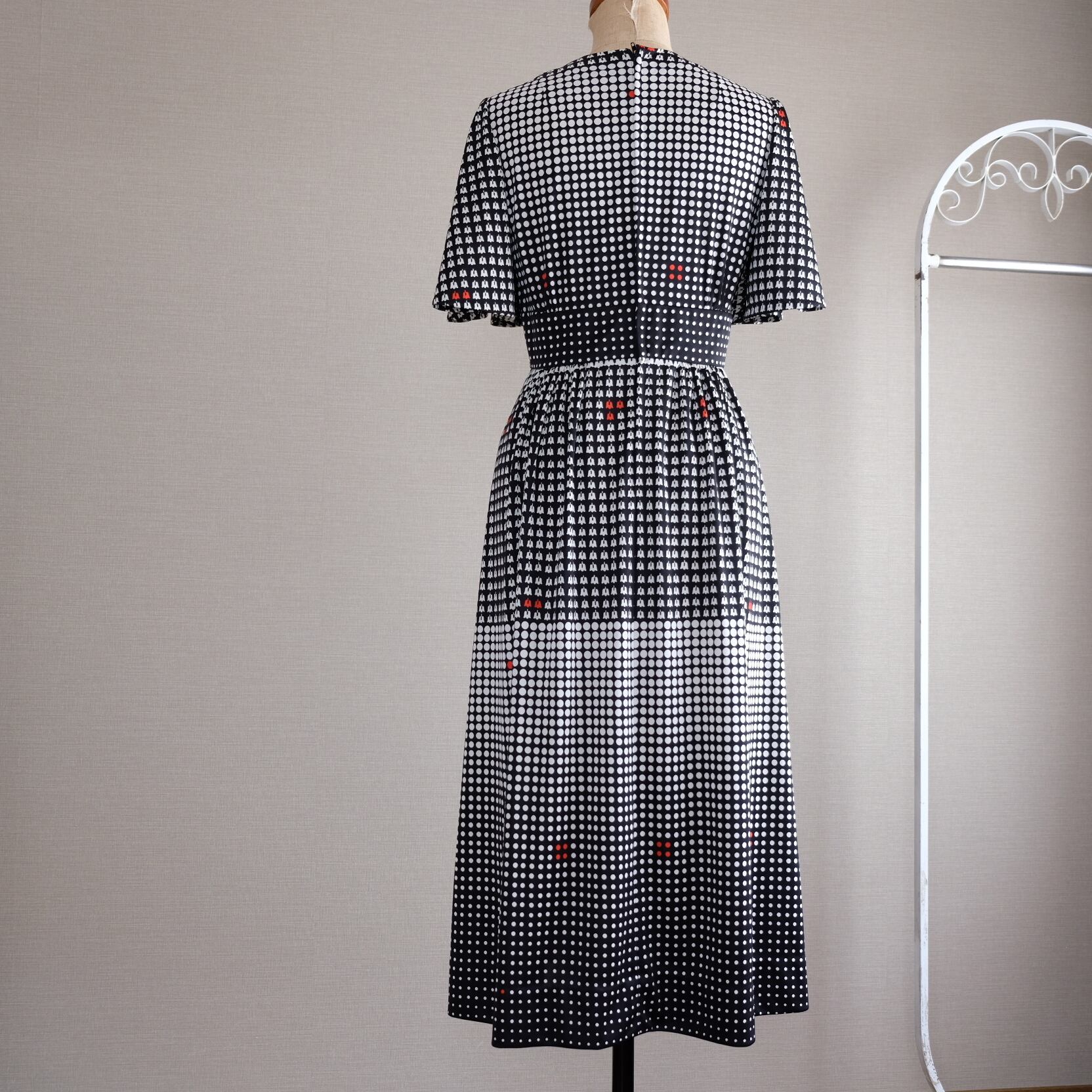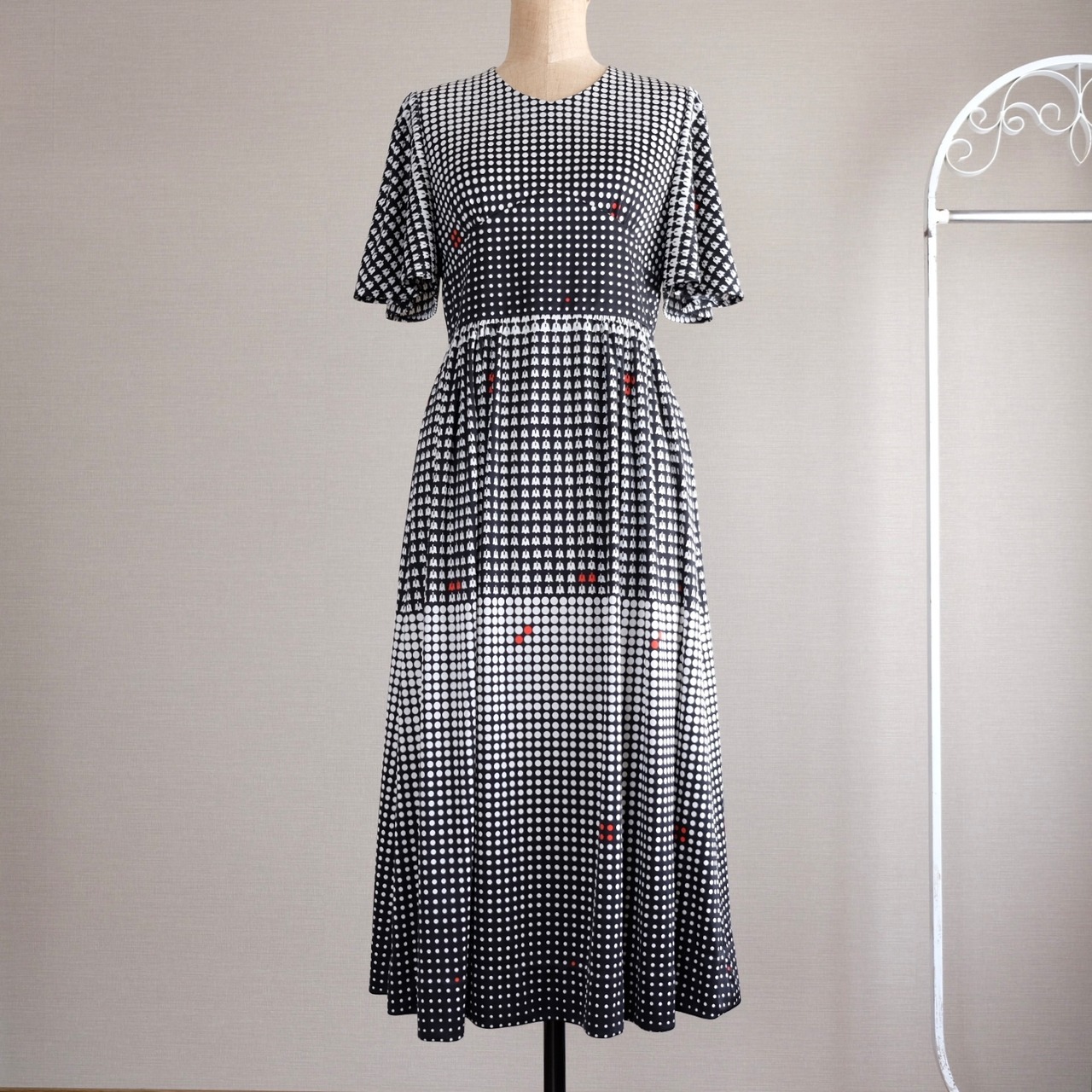 ドットとフラワーがつながったクールな柄とフレア袖がすてきなワンピースです。身幅から脇腹あたりタイトですが、シルエットは抜群にきれいです。