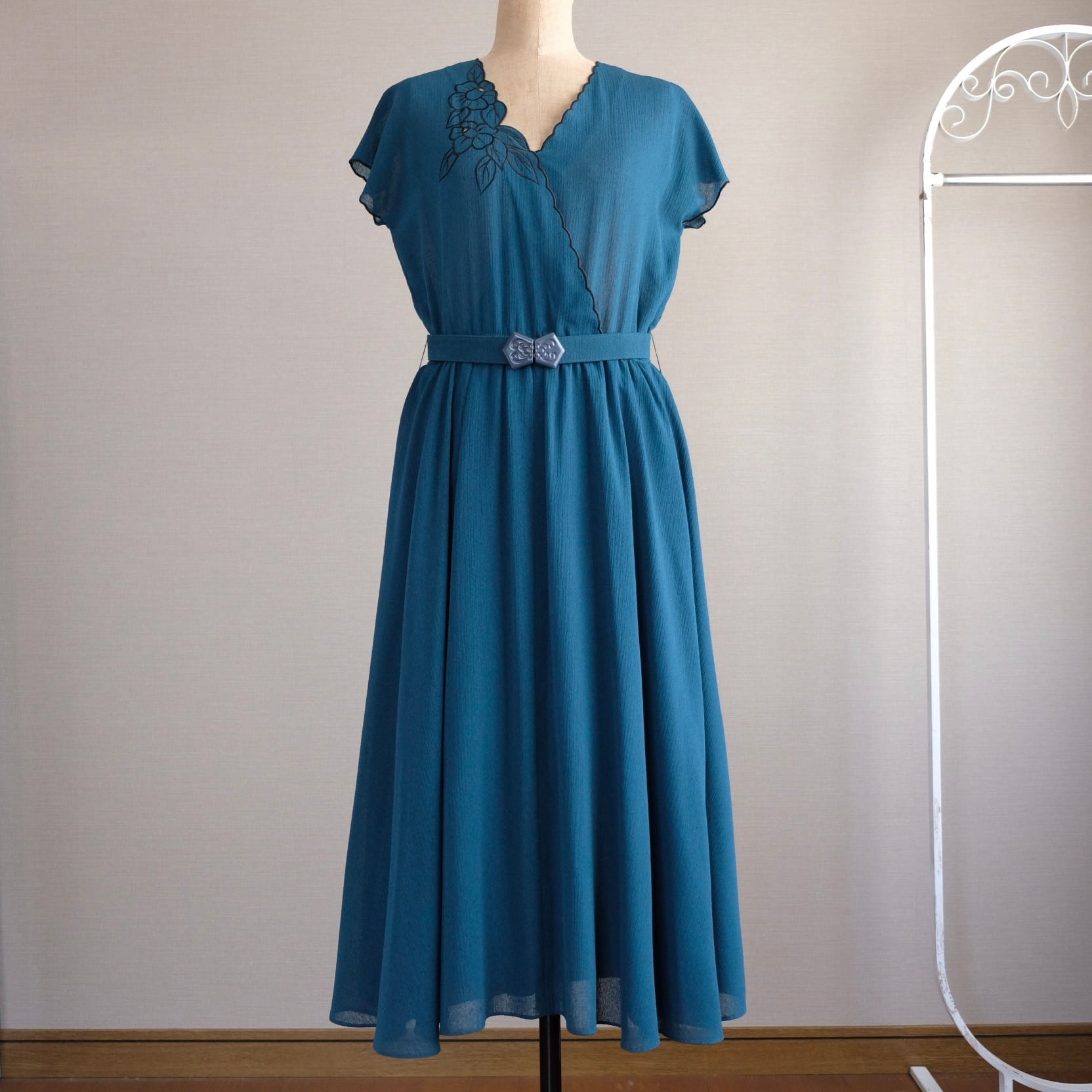 きれいなブルーグリーンと控えめな花刺繍がすてきなワンピースです。スカートのフレアもたっぷりのおしゃれなお品です。