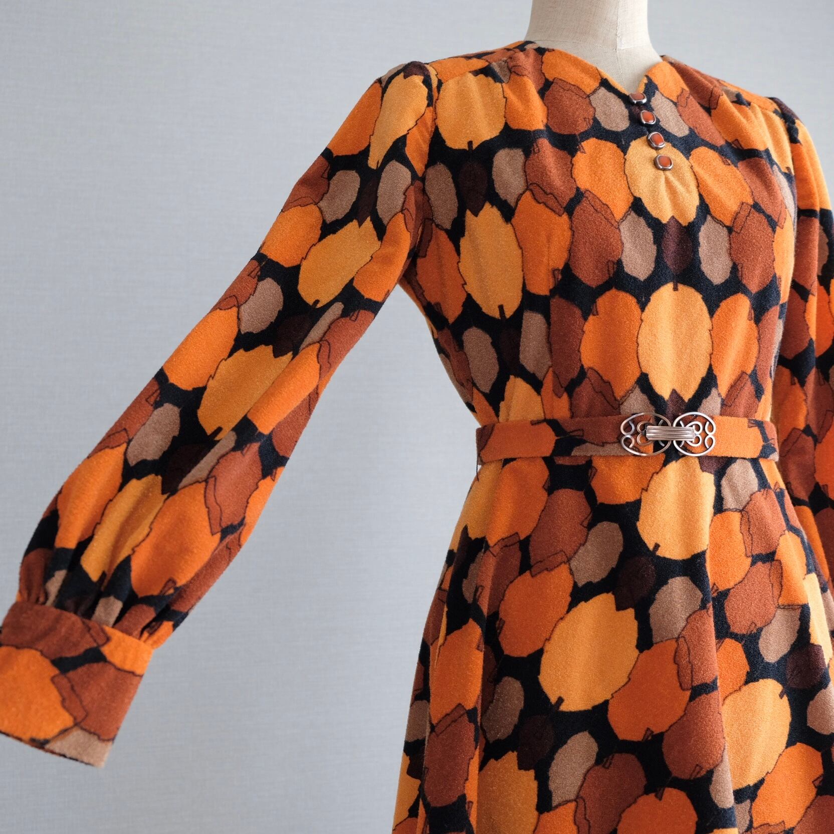 オレンジベースのレトロなリーフ柄がかわいいミニドレスです。襟元やパフスリーヴもナイスデザインです。