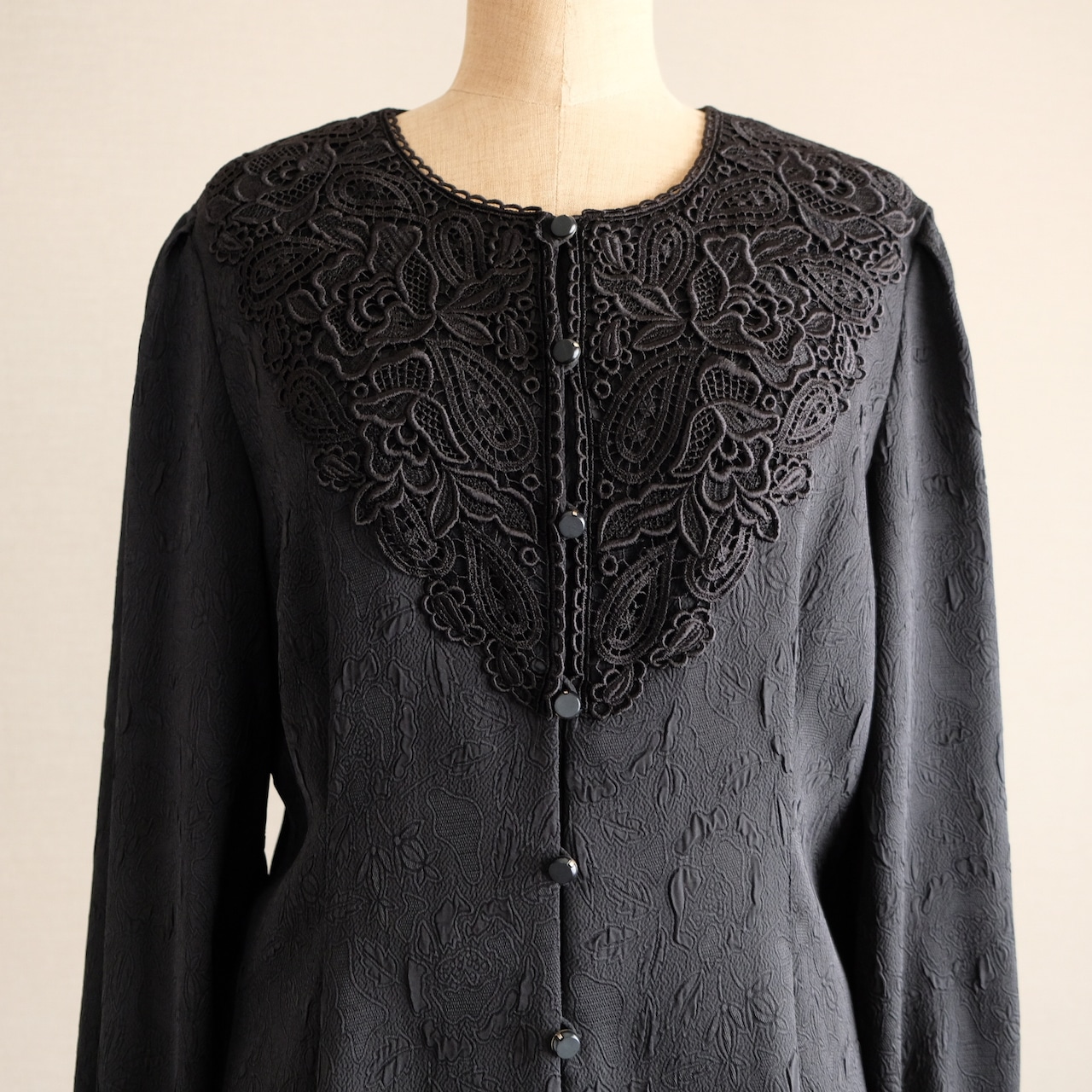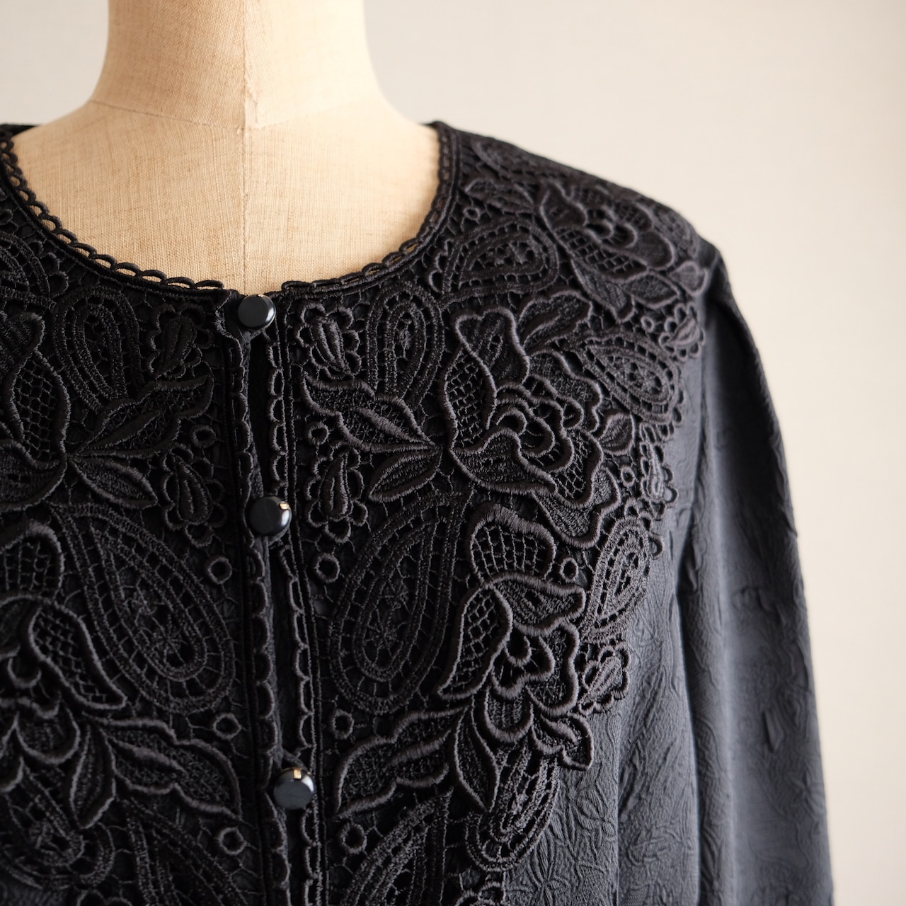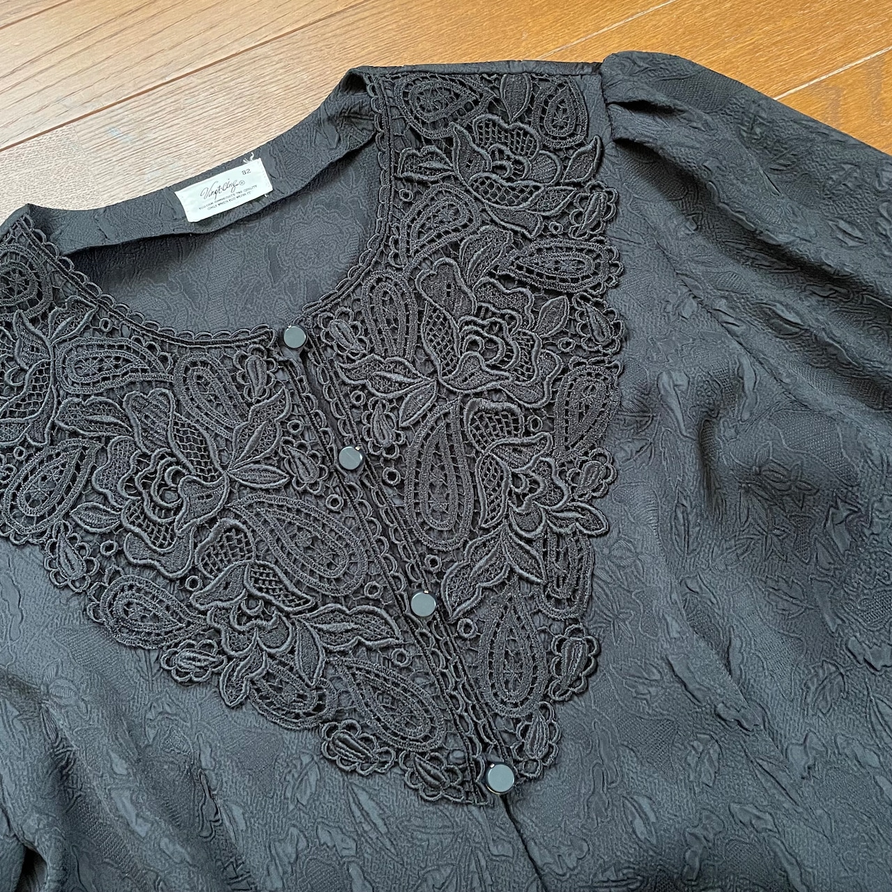 豪華なケミカルレースがすてきなブラウスです。生地にも柄が織り込まれております。