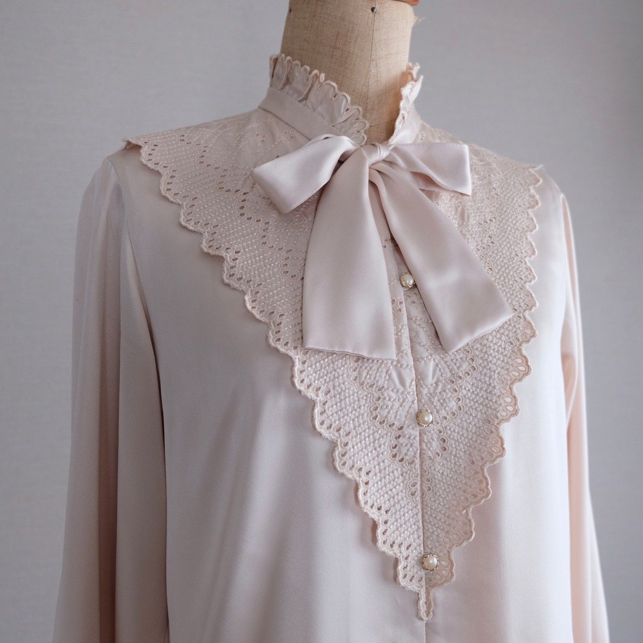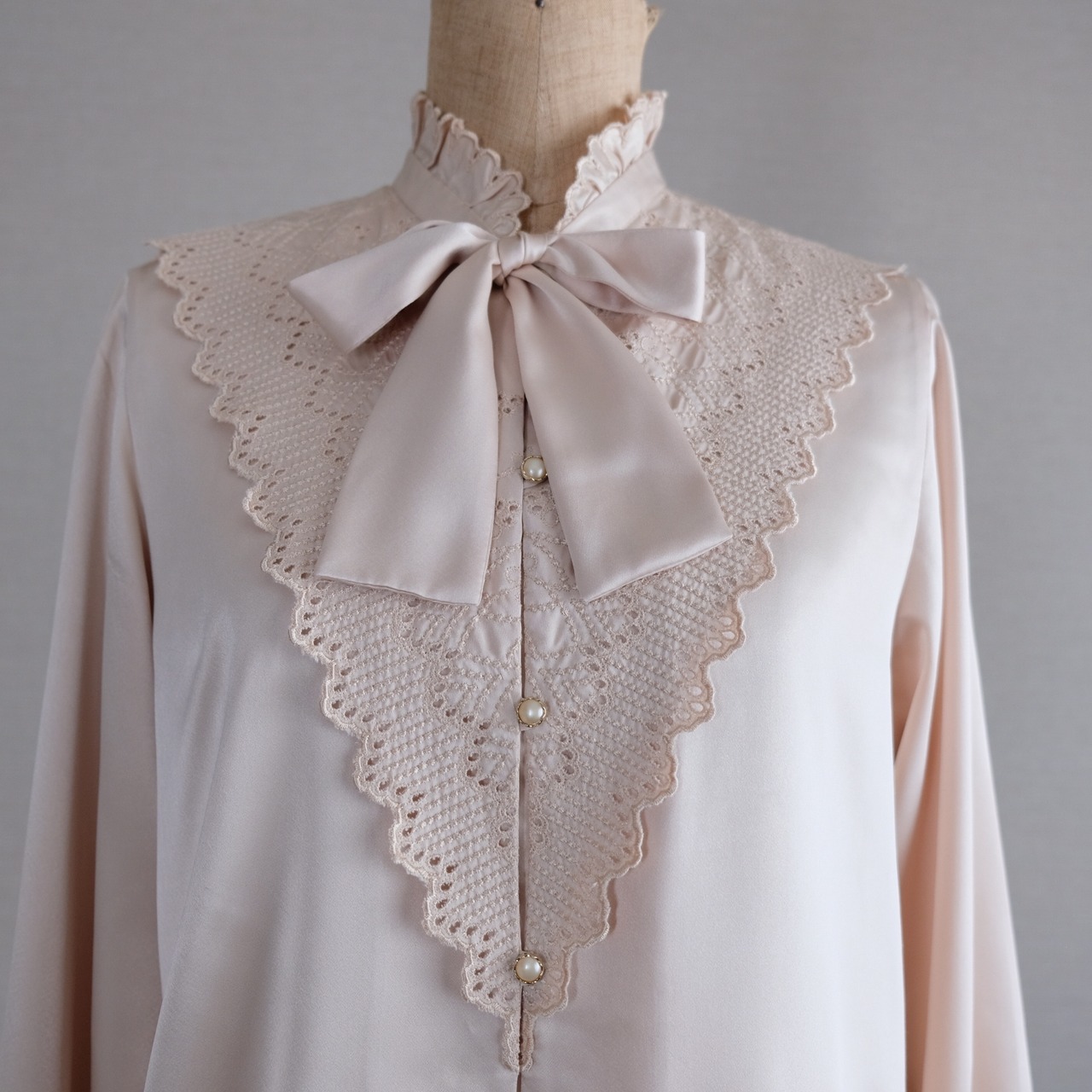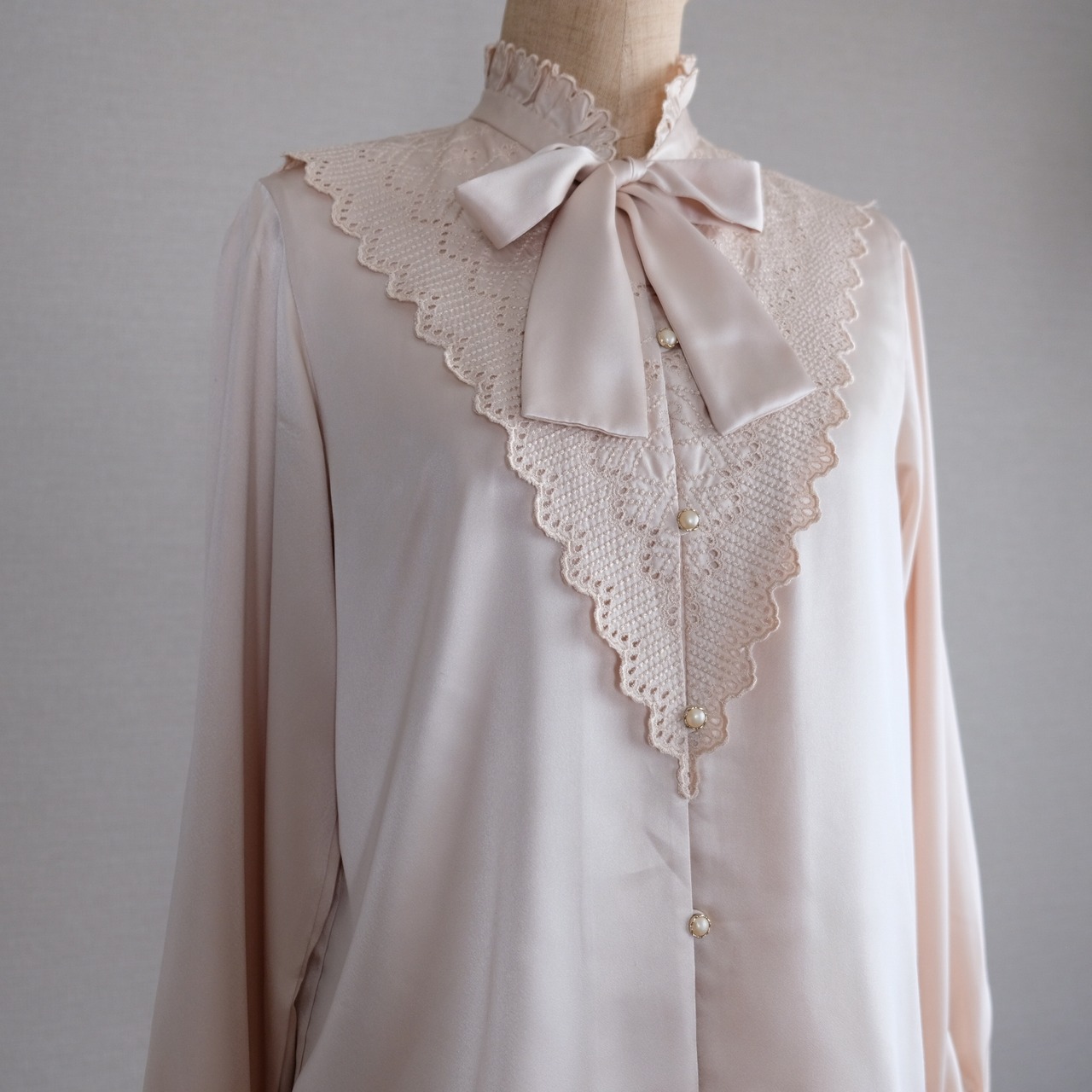 古着 ライトベージュレース&リボンブラウス