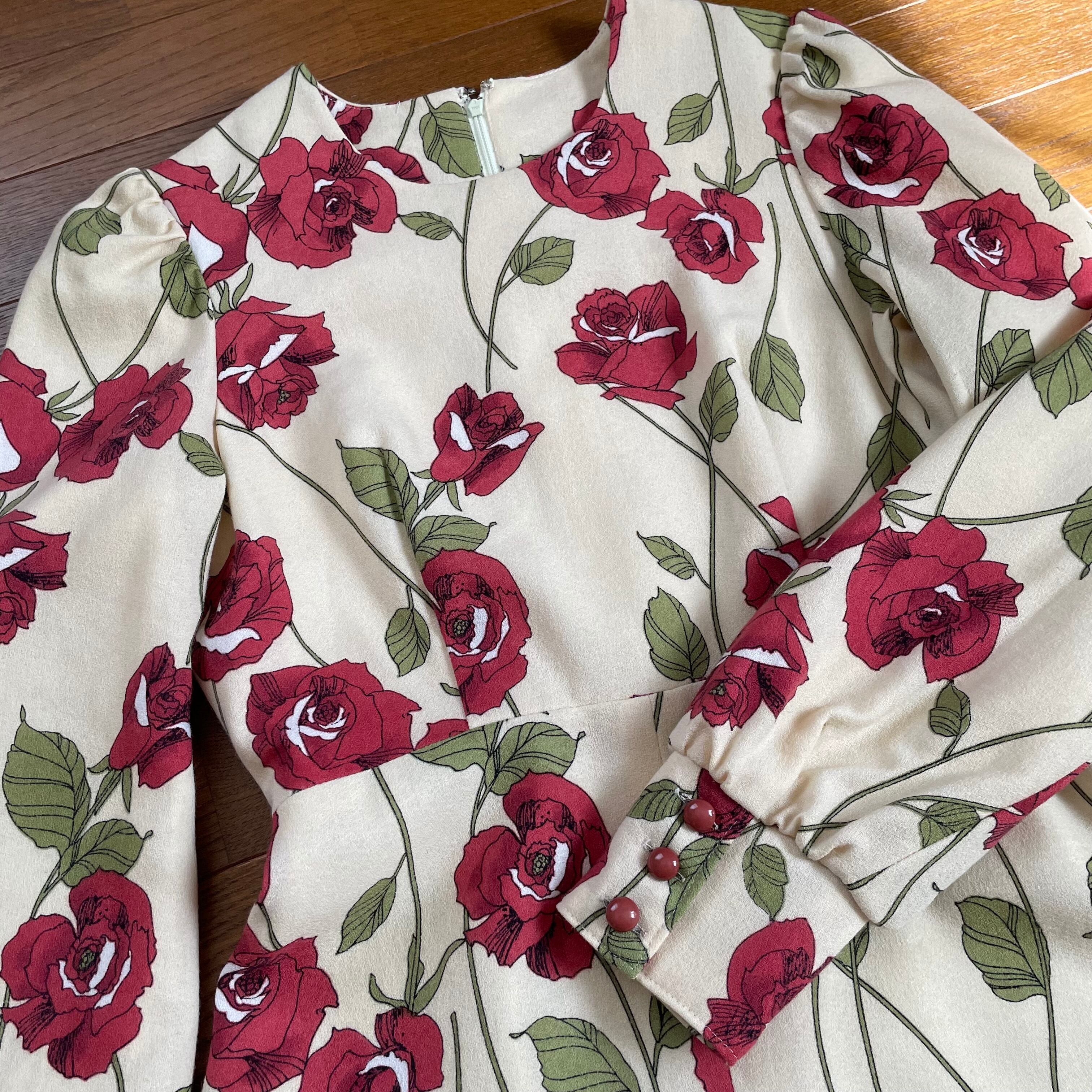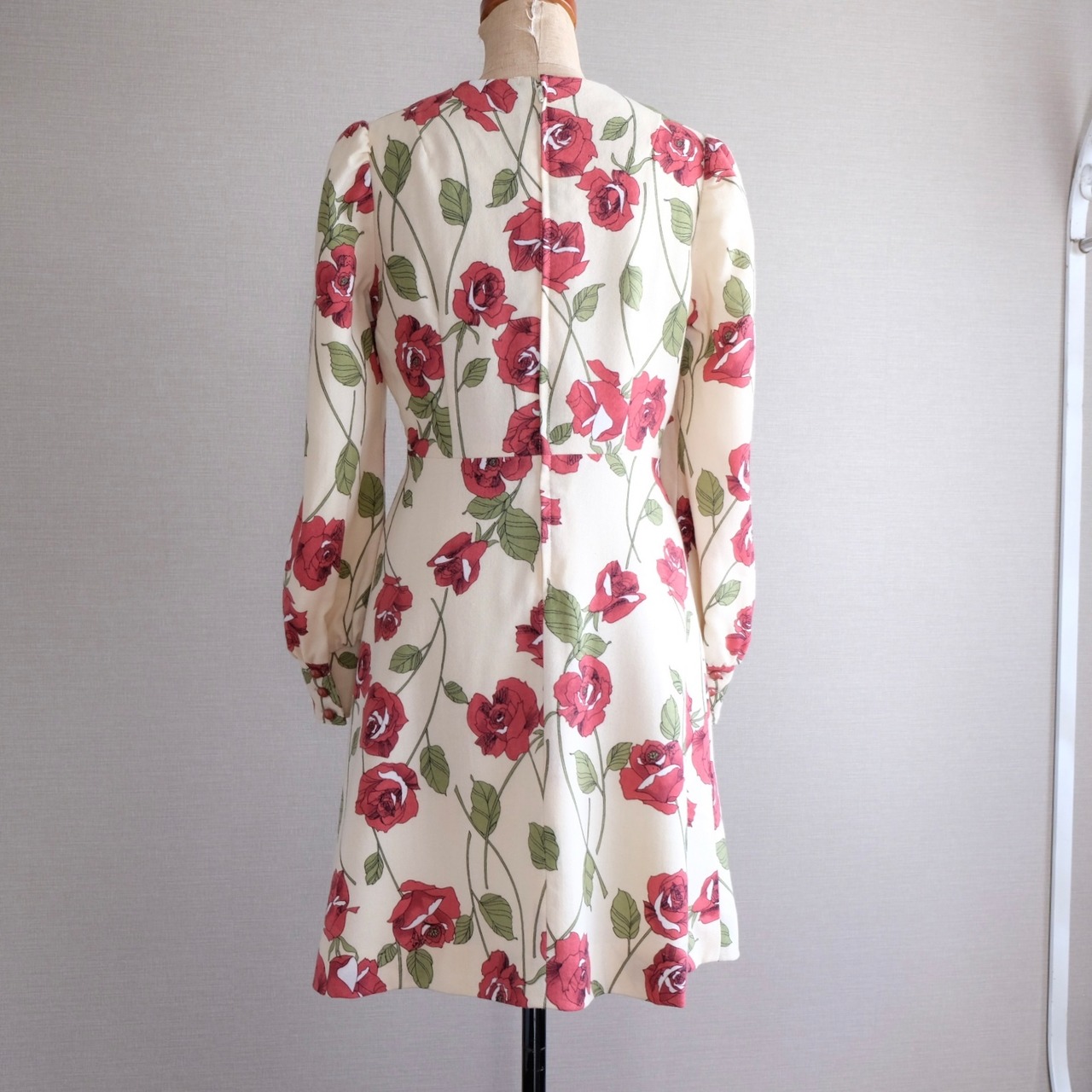 白地に薔薇柄がレトロな60s-70sのワンピースです。エレガントですてきなデザインです。