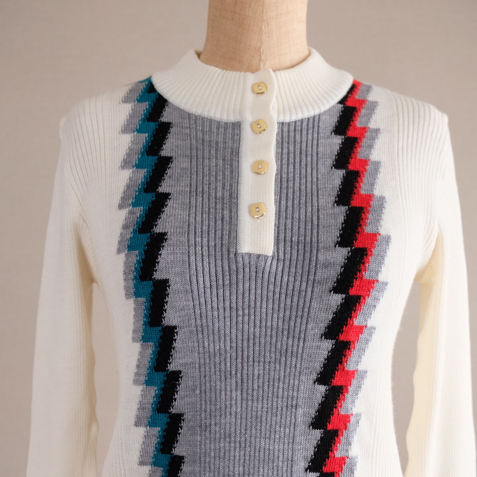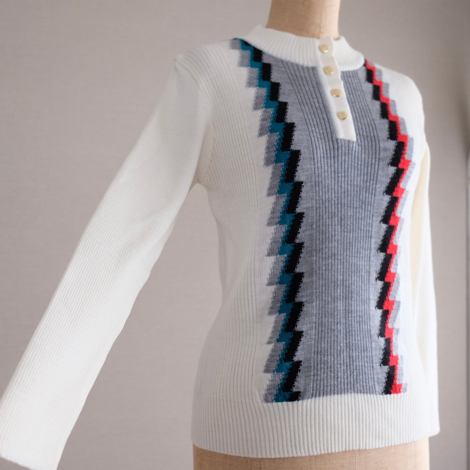 グレーラインと両側のギザギザ模様がかわいいニットセーターです。ホワイトベースでデニムにもスカートにも合わせやすそうなお品です。