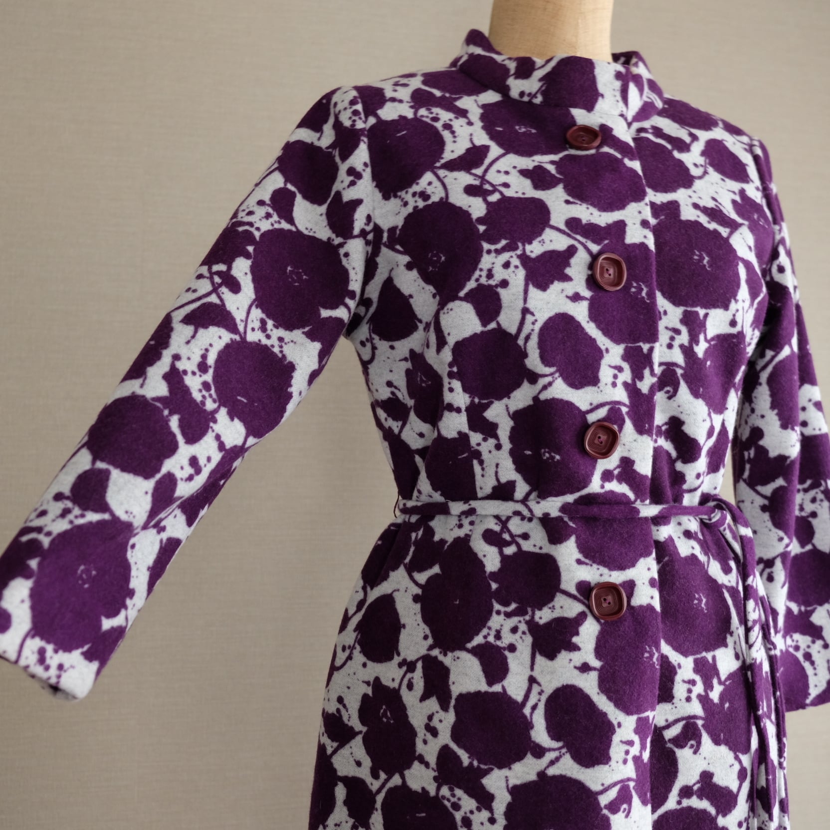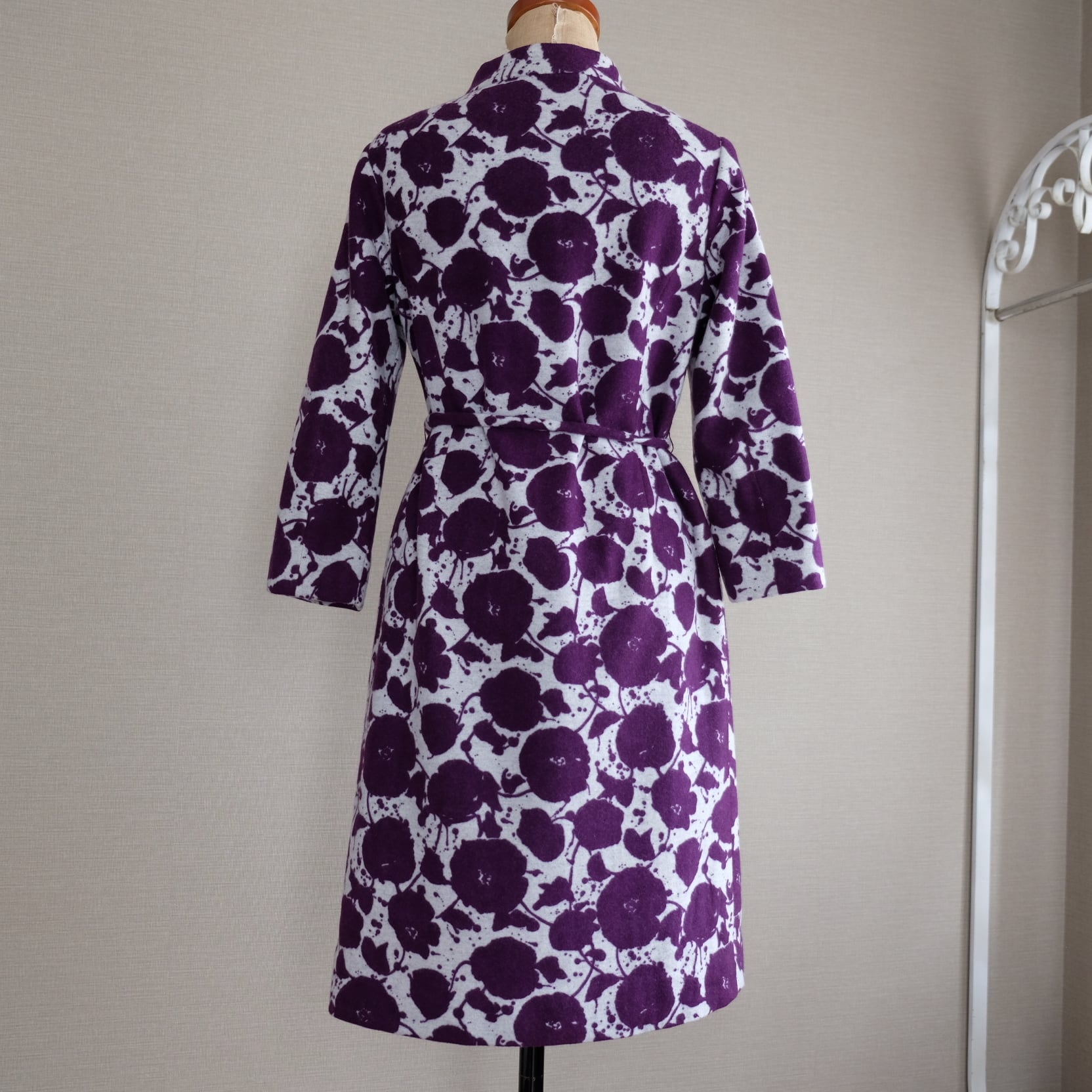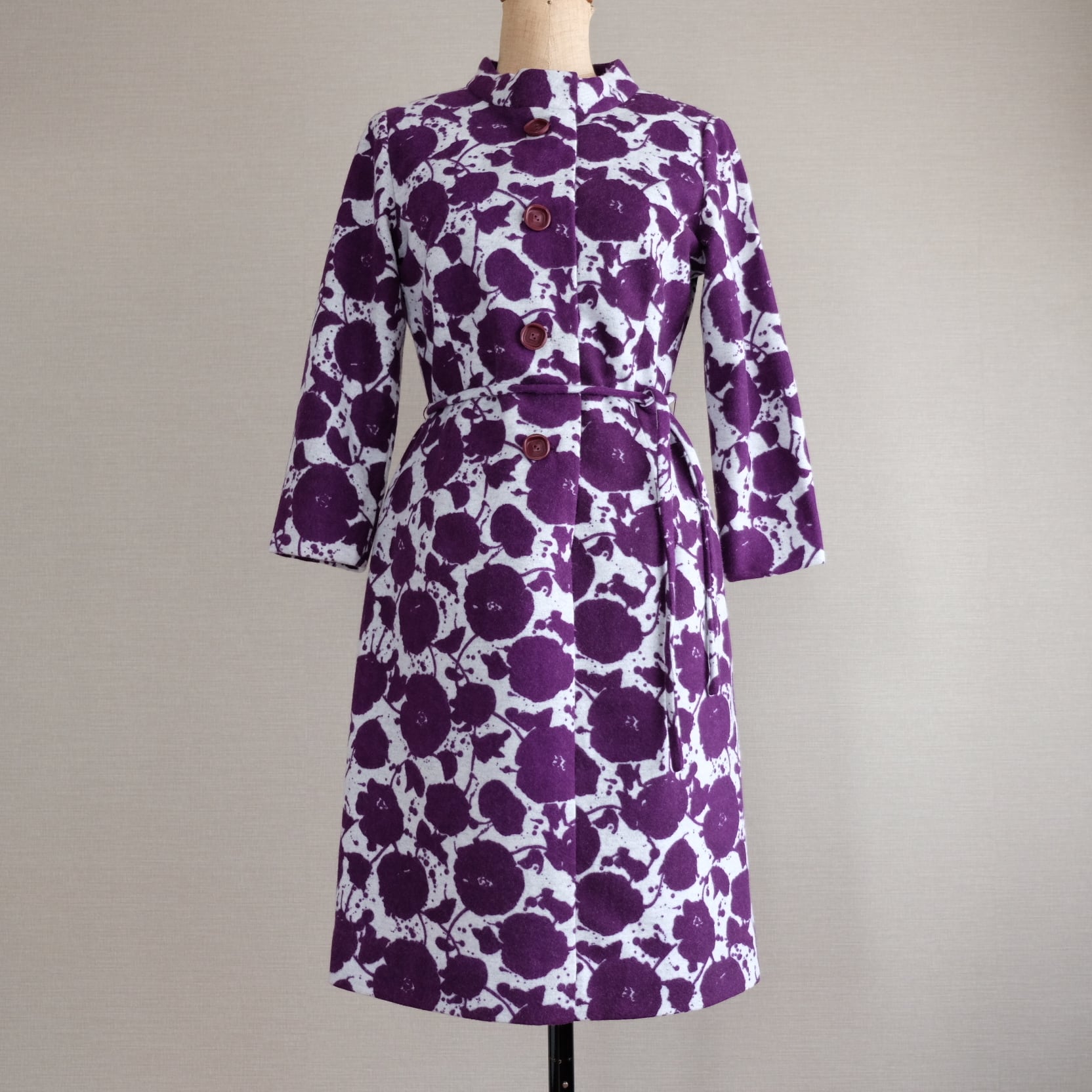 紫と白のコントラストがすてきな花模様のワンピースです。スタンドネックと平面的パターンで60年代らしいシルエットを描き出すすてきなお品です。