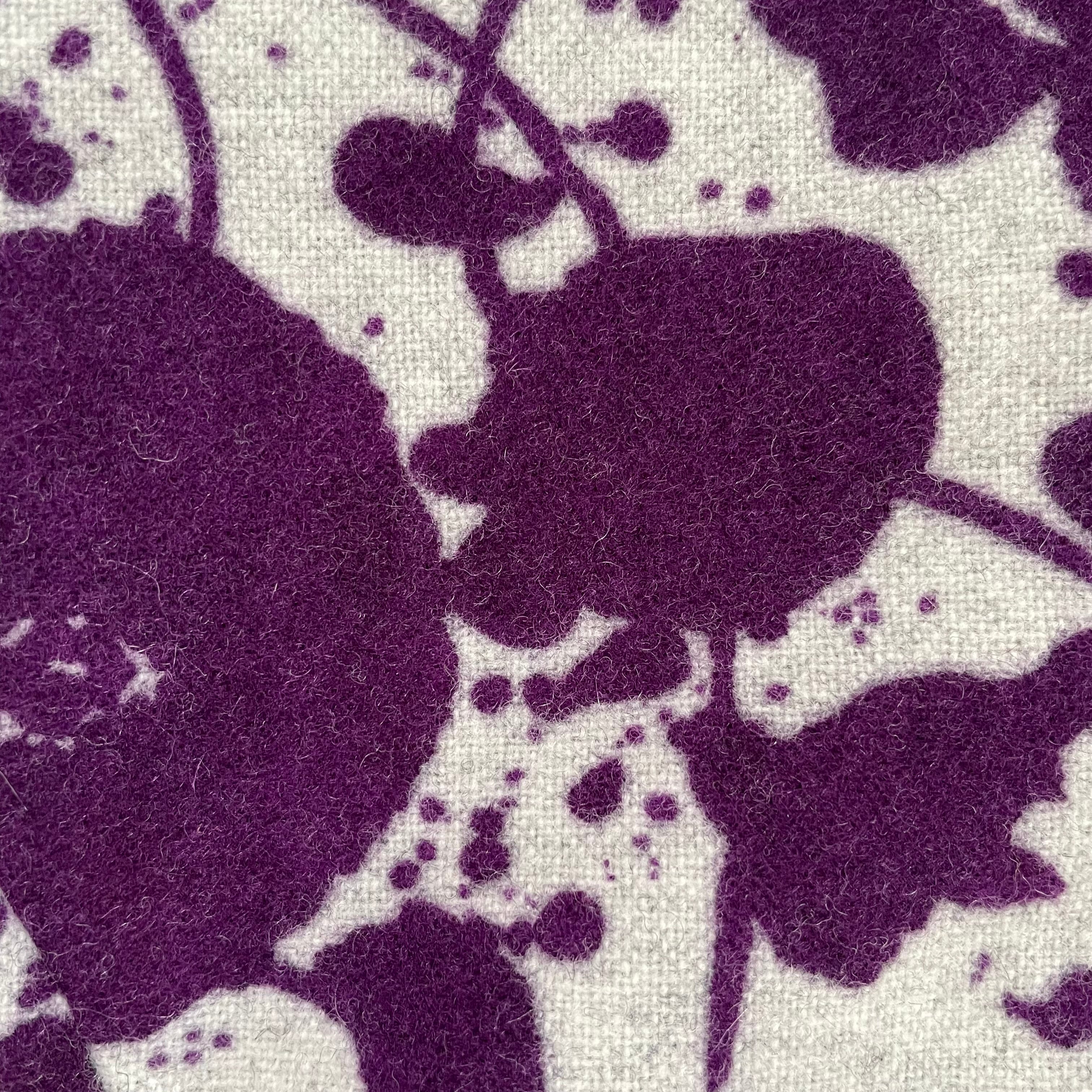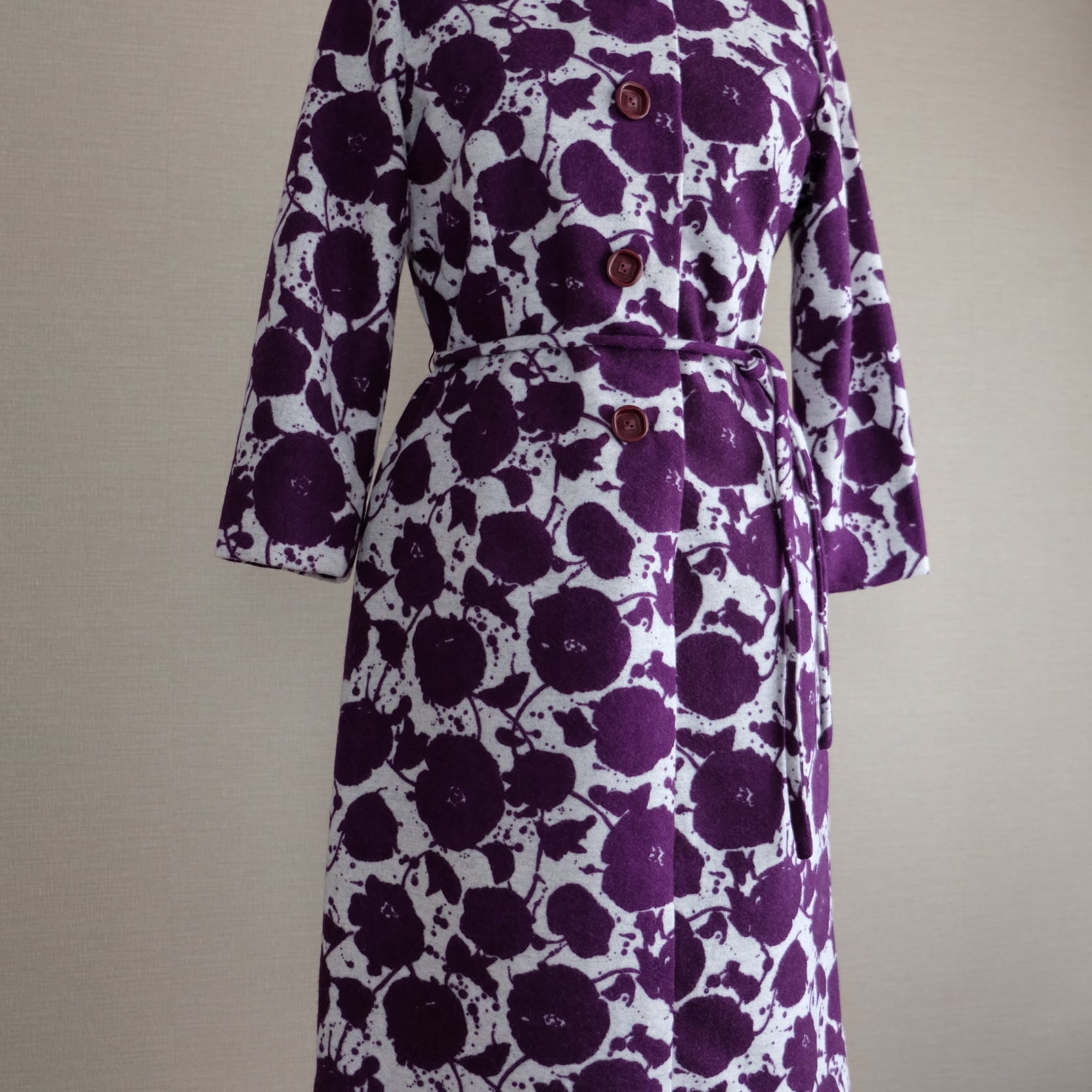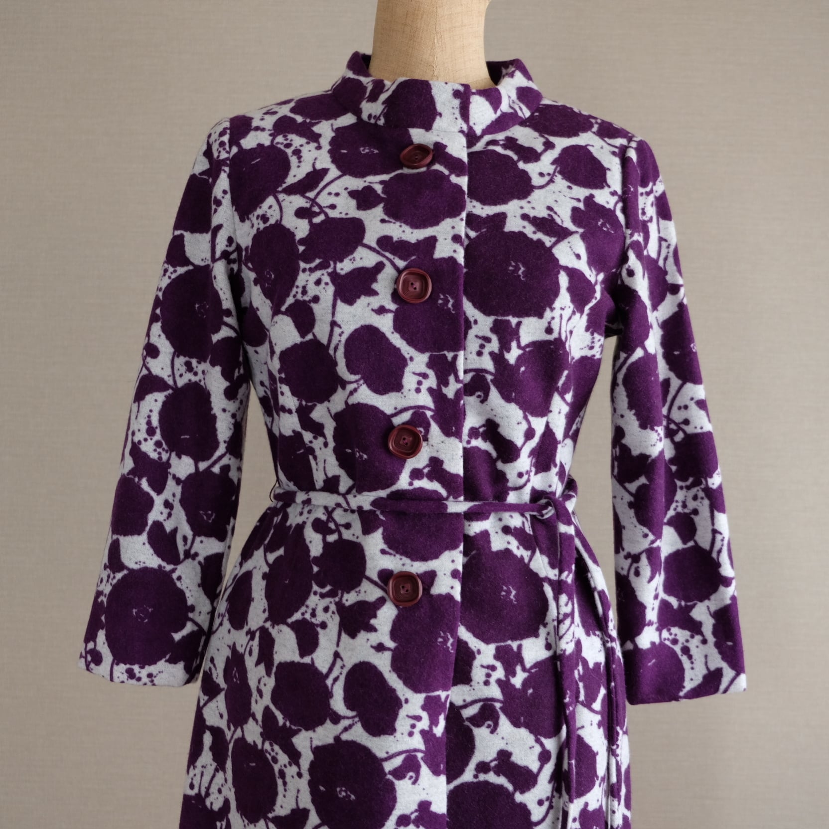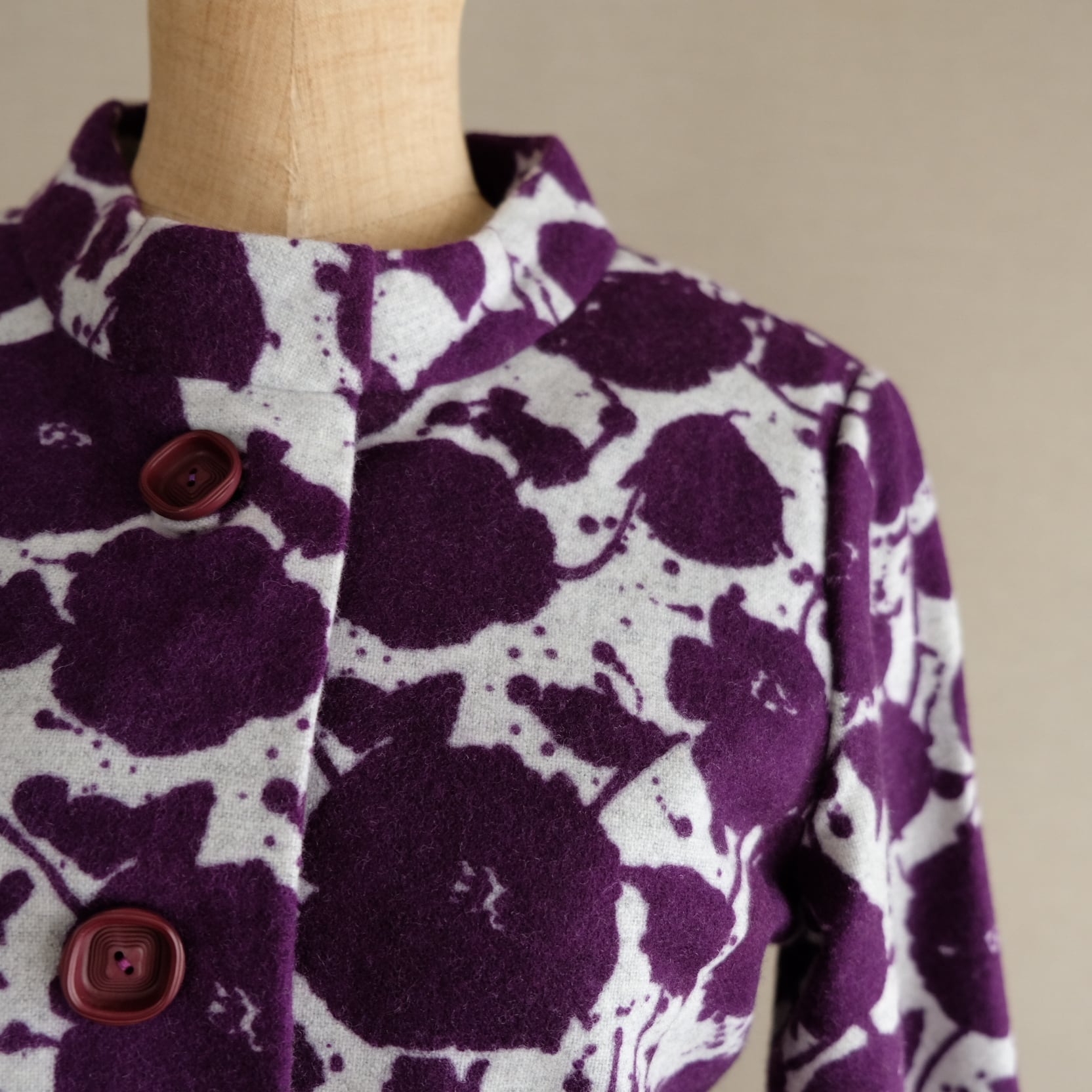 紫と白のコントラストがすてきな花模様のワンピースです。スタンドネックと平面的パターンで60年代らしいシルエットを描き出すすてきなお品です。