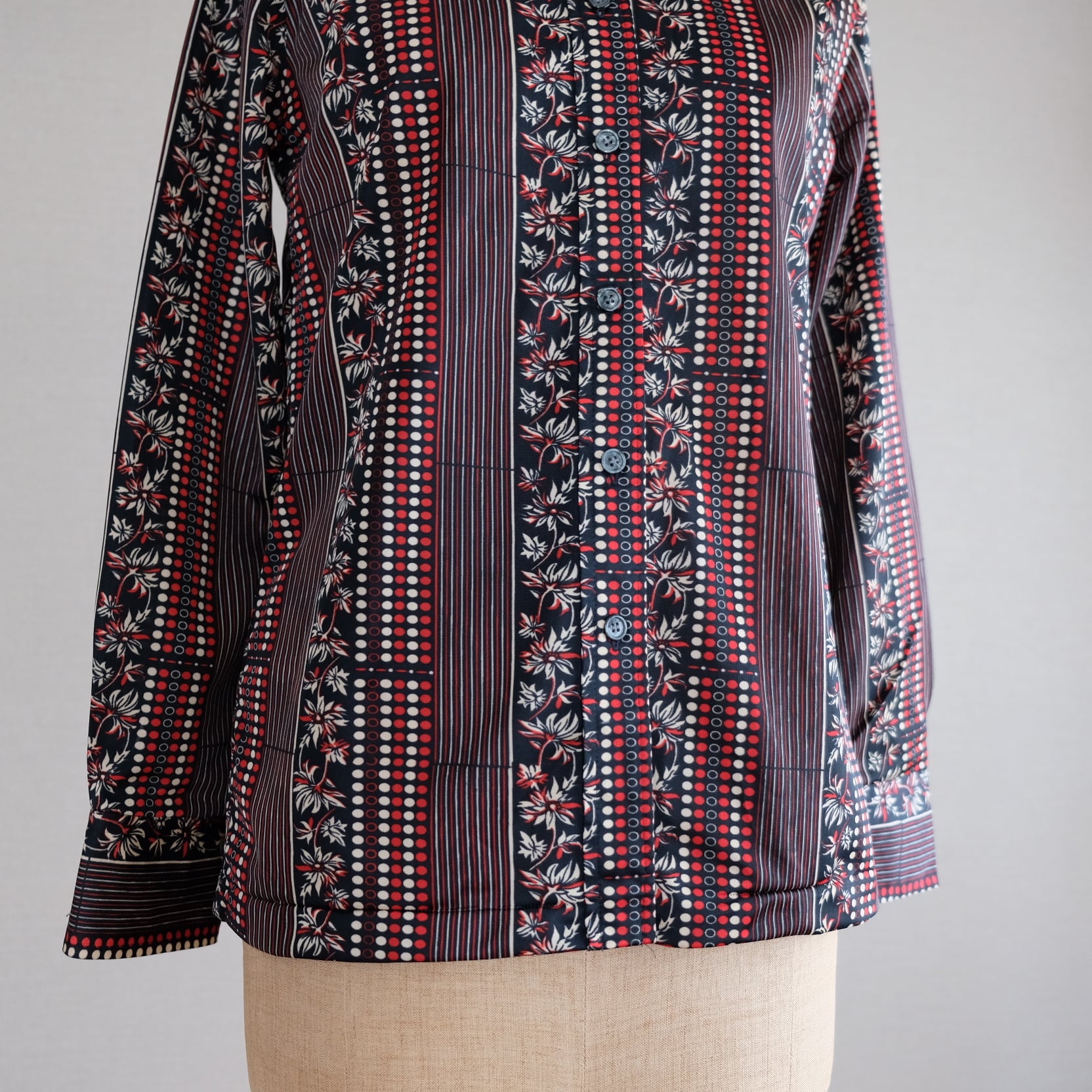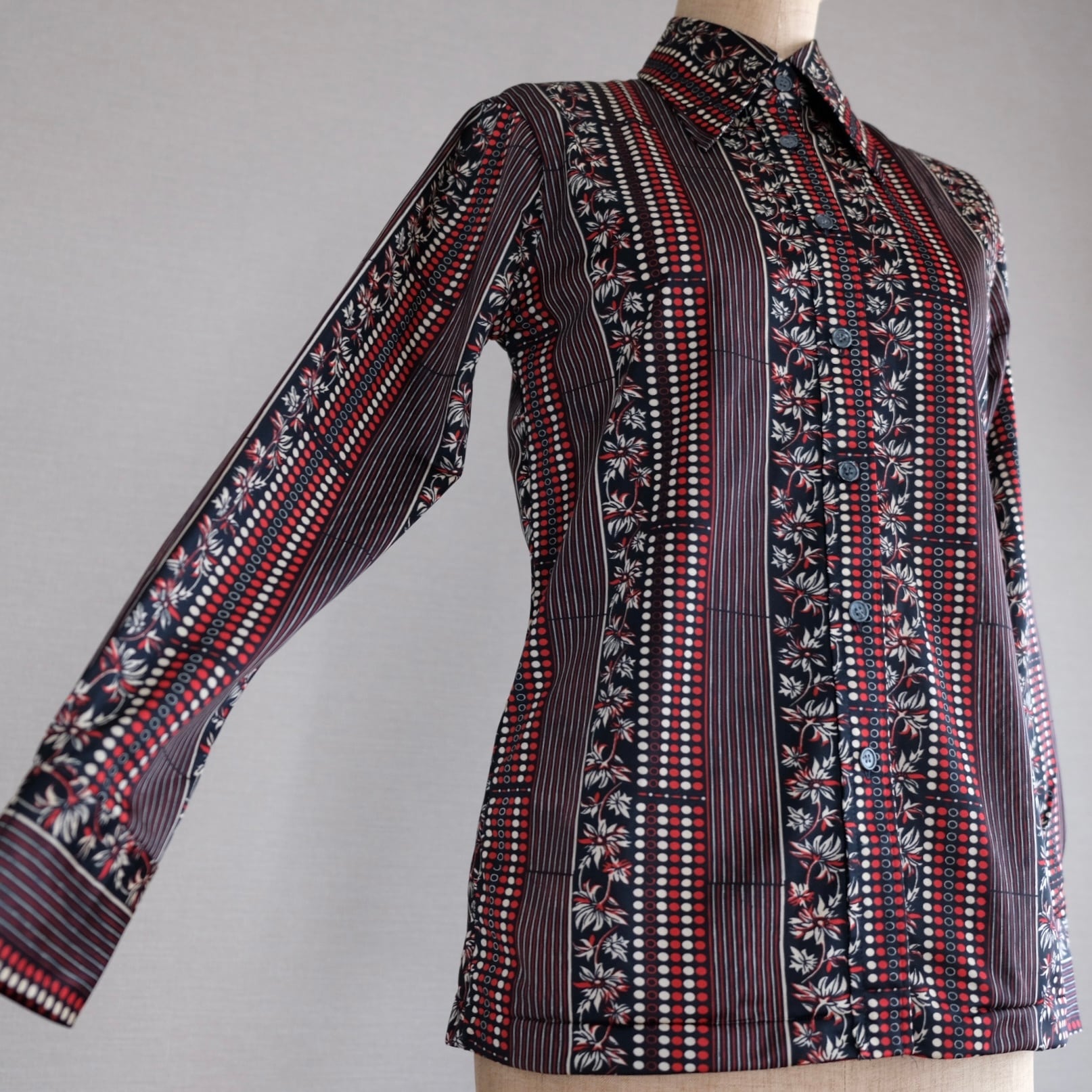レトロ&クールな柄と配色がすてきなブラウスです。ジャケットやジャンパースカートなどと合わせておしゃれに着こなして下さい。
