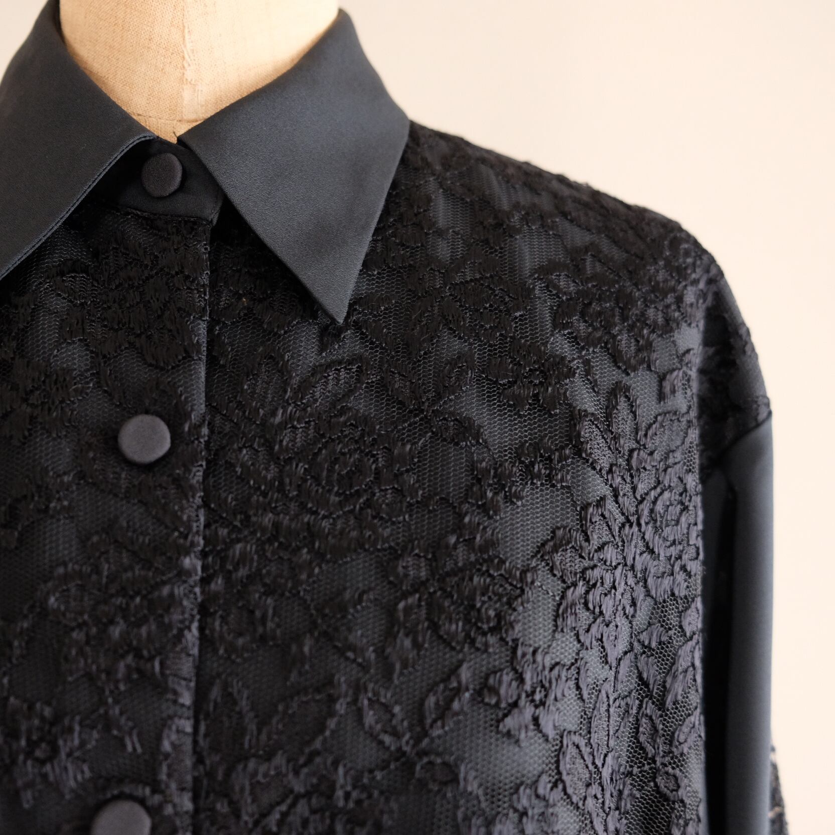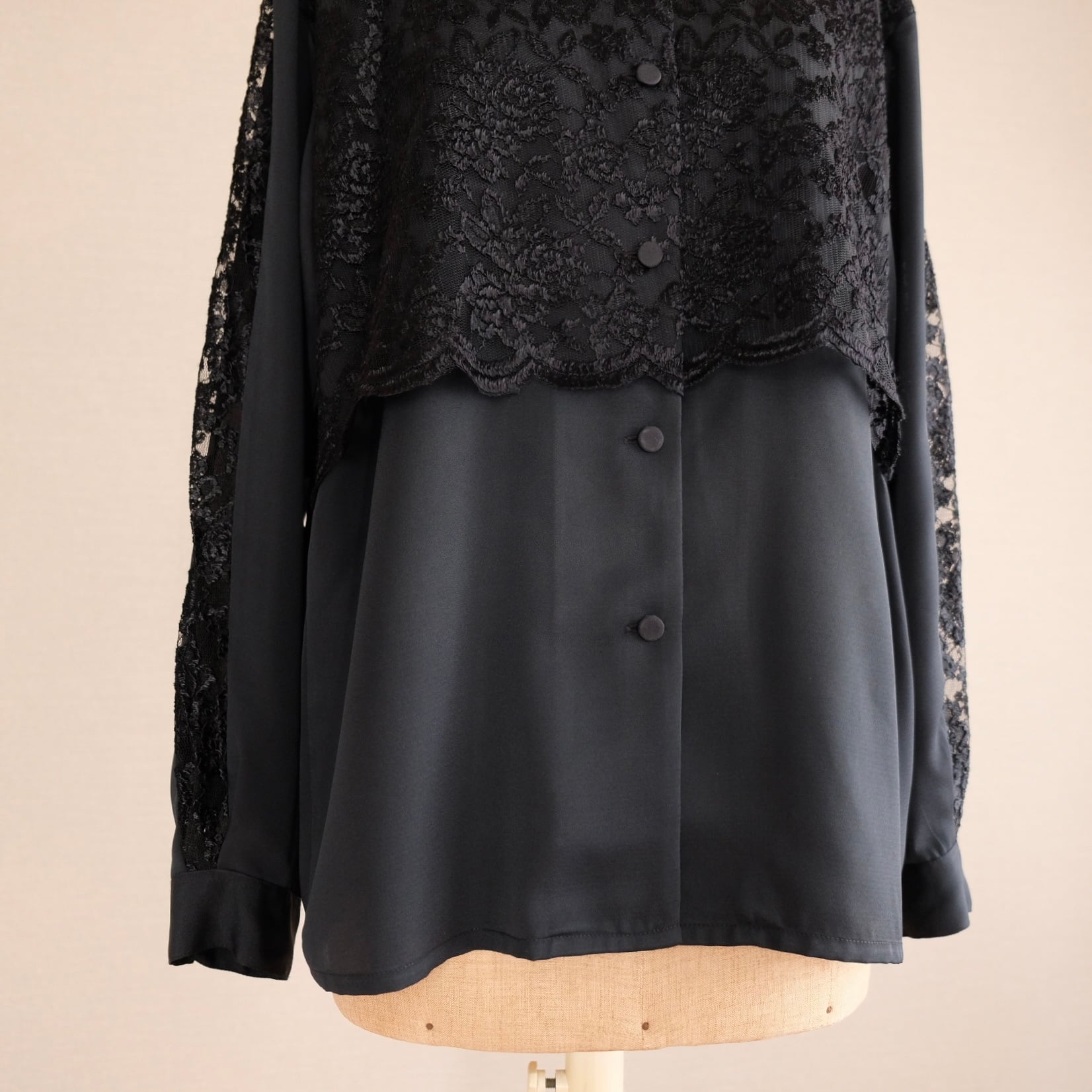 古着 袖&フロントレースブラックブラウス