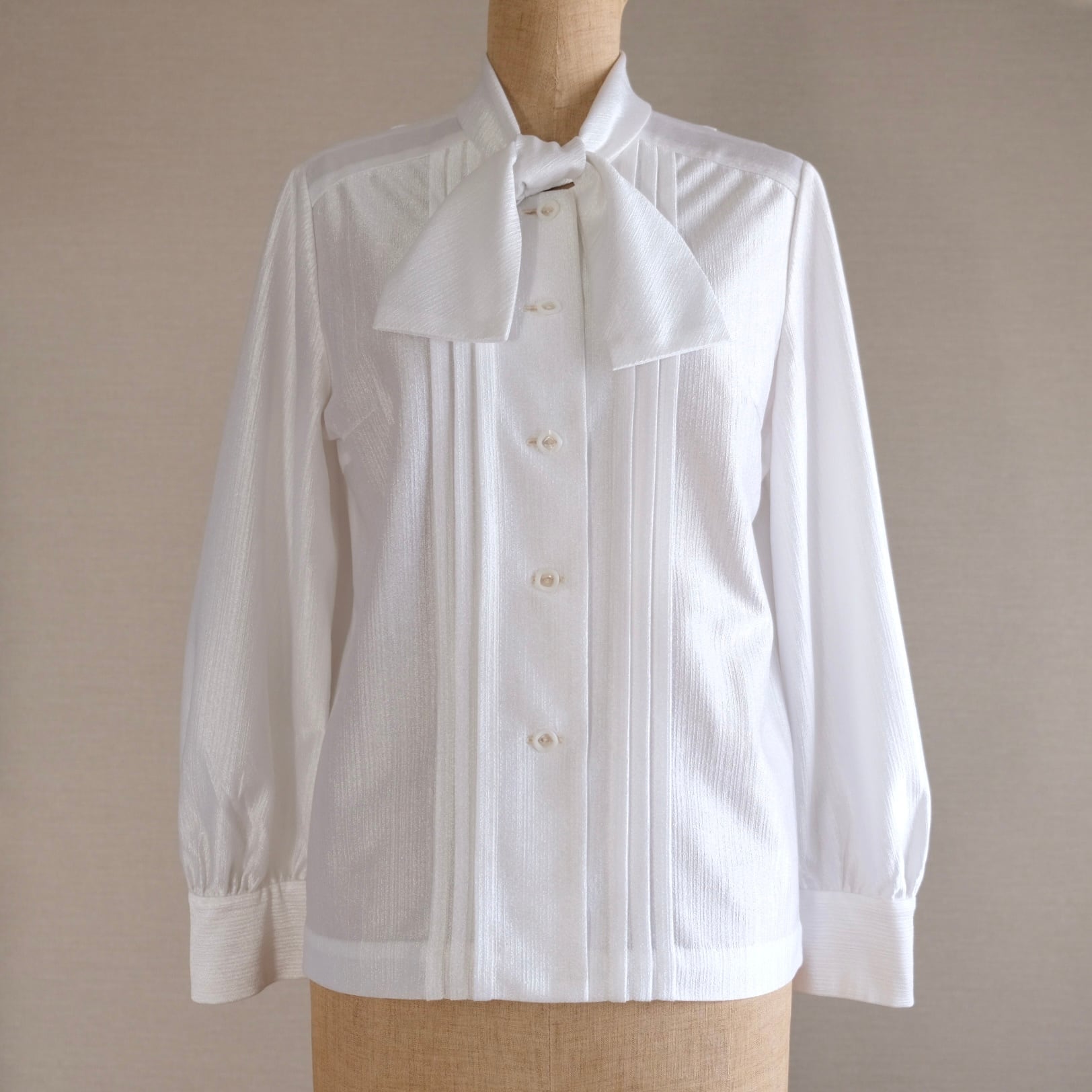 大きなタイがすてきなホワイトブラウスです。やや光沢感のあるしっかりした生地で丁寧に仕立てられたお品で、シルエットも抜群です。