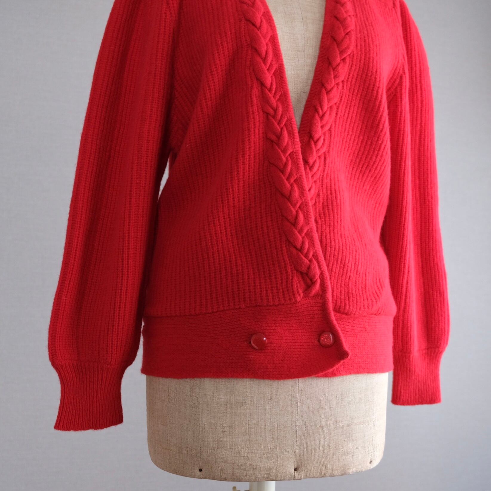 パフスリーヴとカシュクールの編みデザインがかわいいニットカーディガンです。裾ボタン部分がブラウジングなしで着るとややきつめですので、前開きで着ていただいてもすてきたど思います。