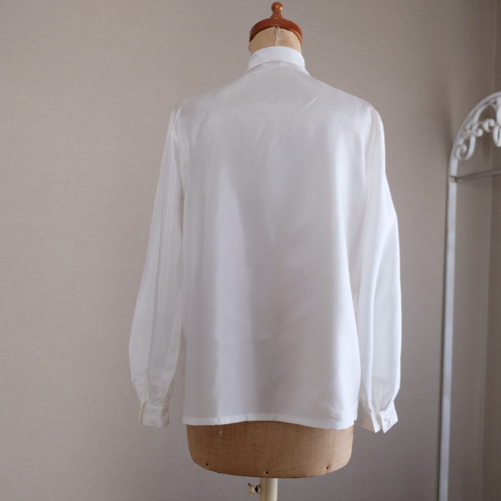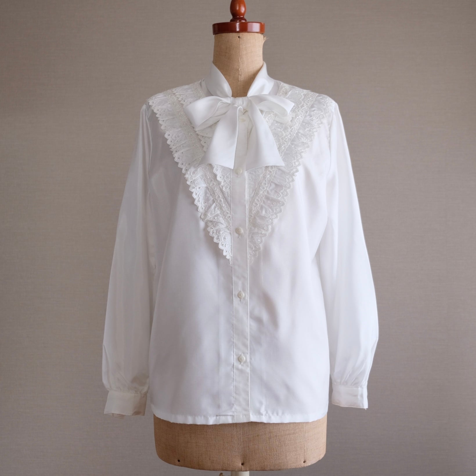 古着 ホワイトVフリル&リボンブラウス