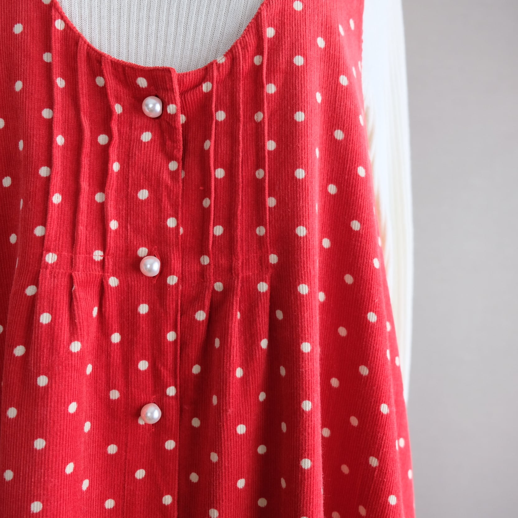 細コーデュロイにドット&パールボタンがたまらなくかわいい80sジャンパースカートです。ゆったりしたシルエットで着心地楽ちん❤︎ふぁんしー好きにはたまらないお品です。