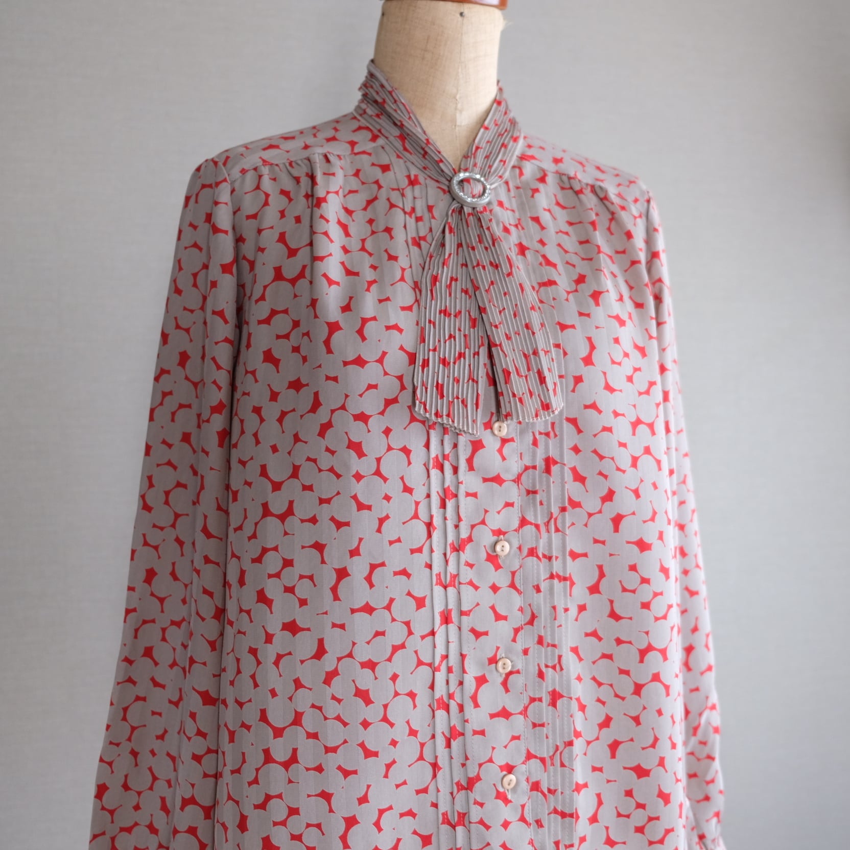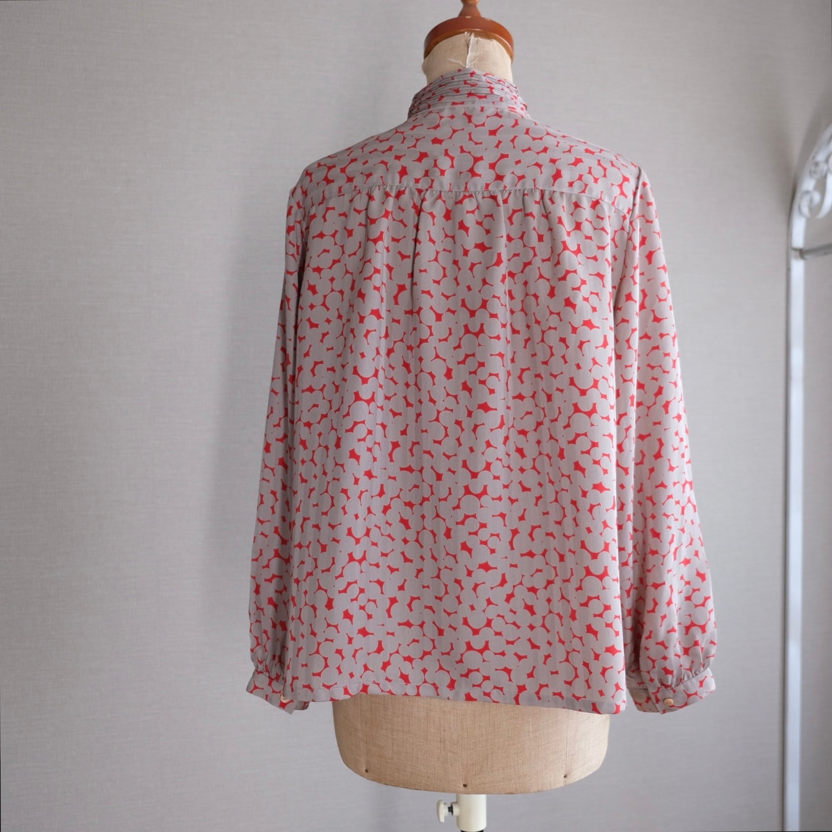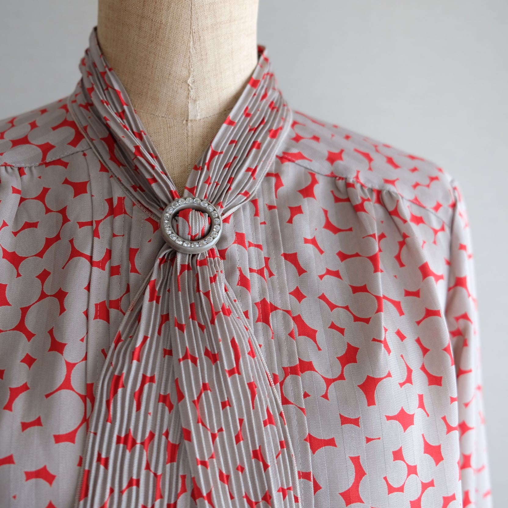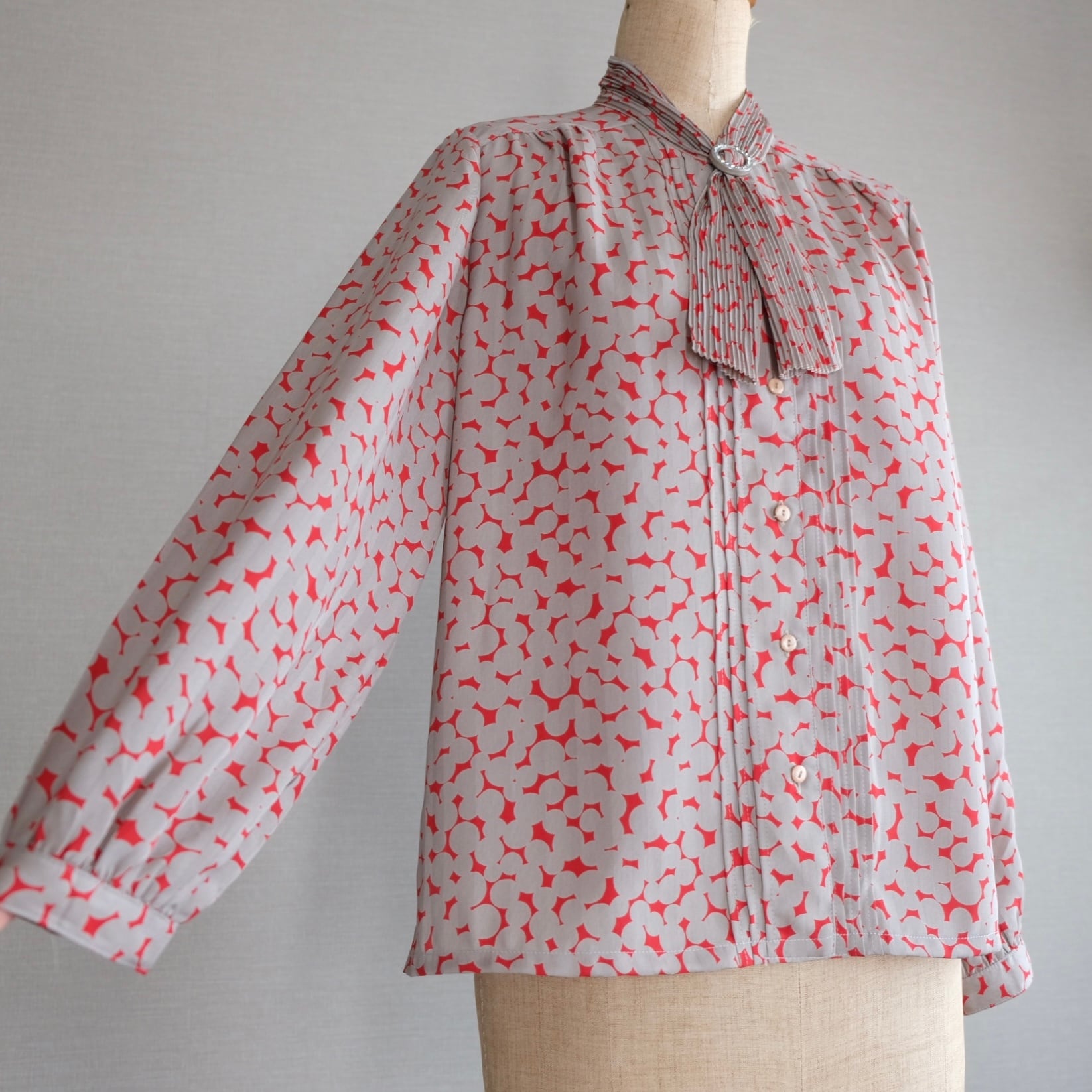 キラキララインストーンのタイ留めとおしゃれな変形ドット柄がすてきなブラウスです。グレーと赤の配色バランスも良く昭和エレガンスなお品です。