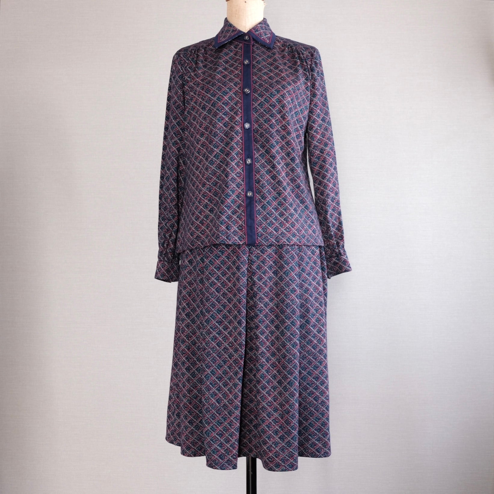襟元とセンターのラインとステッチ、上品なチェック柄がすてきなセットアップです。お食事に、ちょっとしたお出かけに活躍してくれそうなお品です。