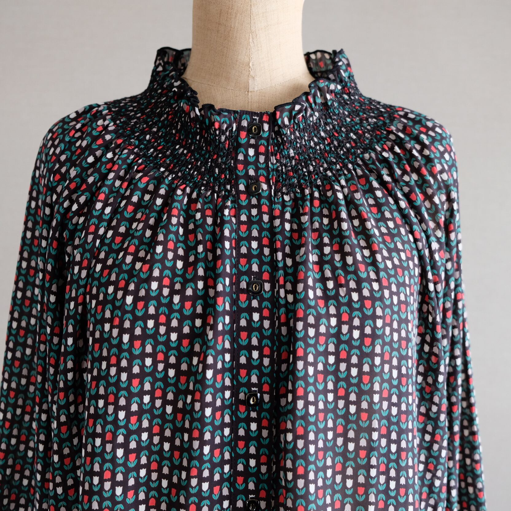 チューリップ柄と襟のデザインがすてきなブラウスです。ゆるっとしたシルエットもかわいいです。