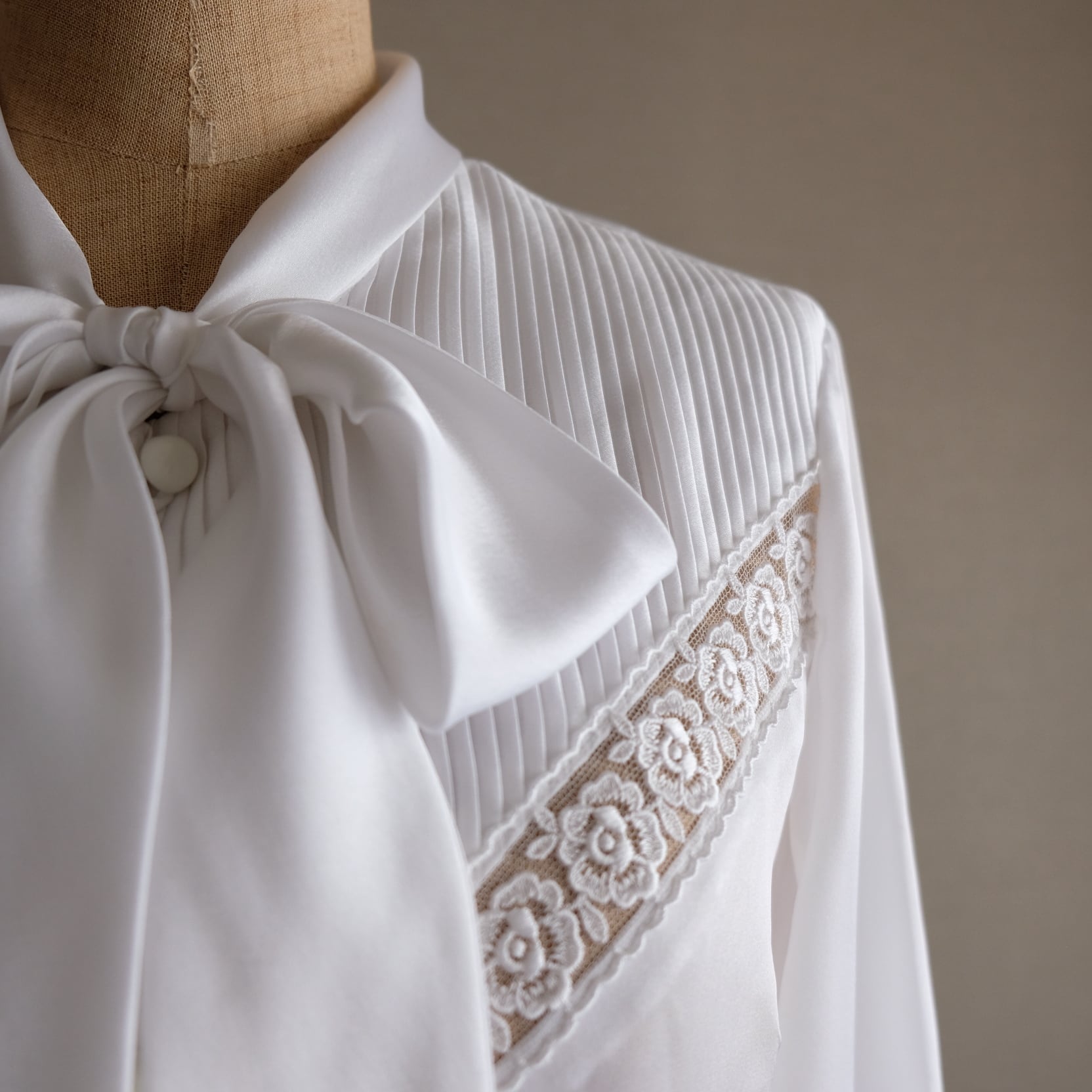 細身のシルエットと光沢感のある生地・袖の4つボタンなど、どこをとっても昭和感溢れるホワイトブラウスです。昭和エレガンスなあなたに❤︎