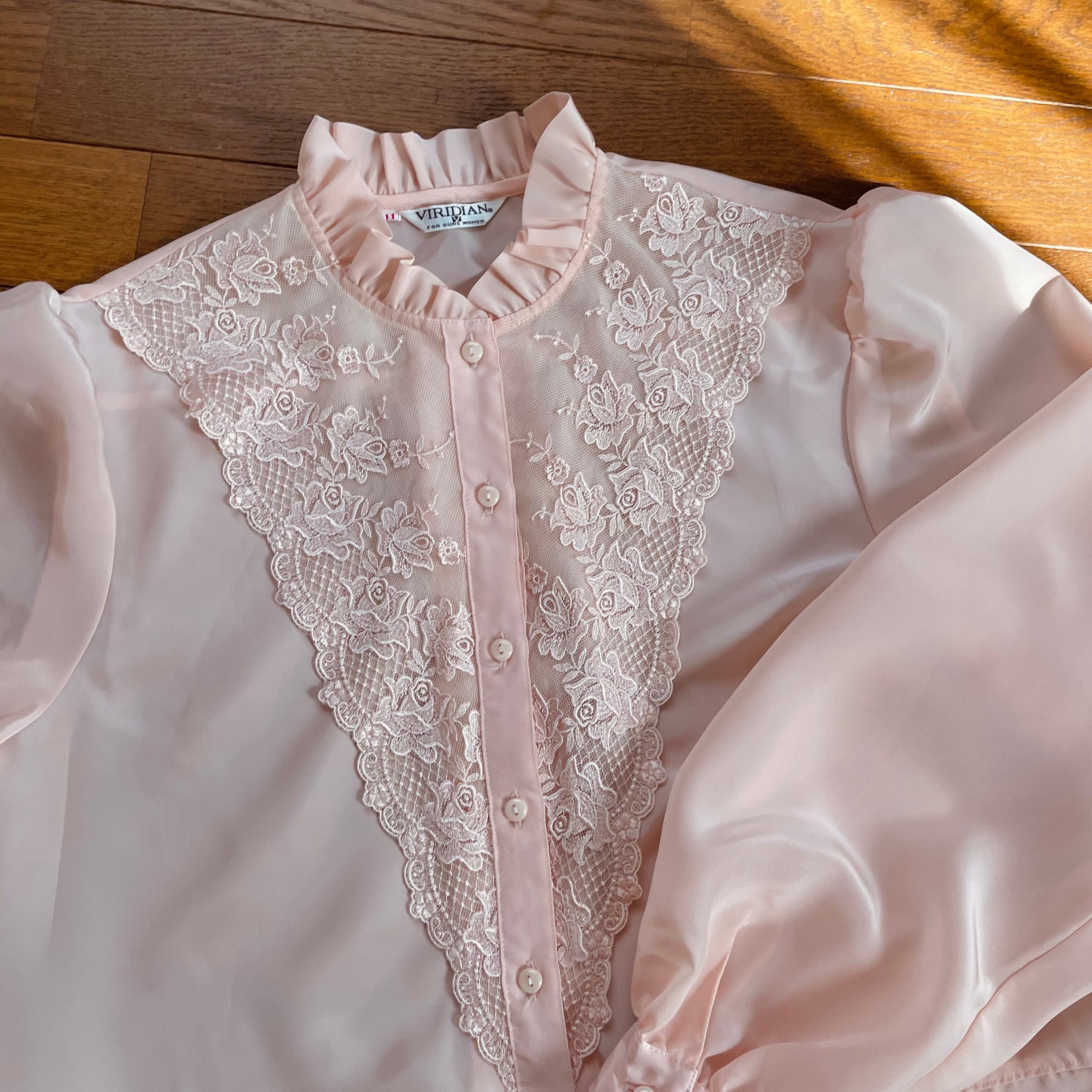 かわいい薄ピンクと大きなパフスリーヴにフリル&レースデザインがラブリーなブラウスです。裾のデザインも洒落てます。