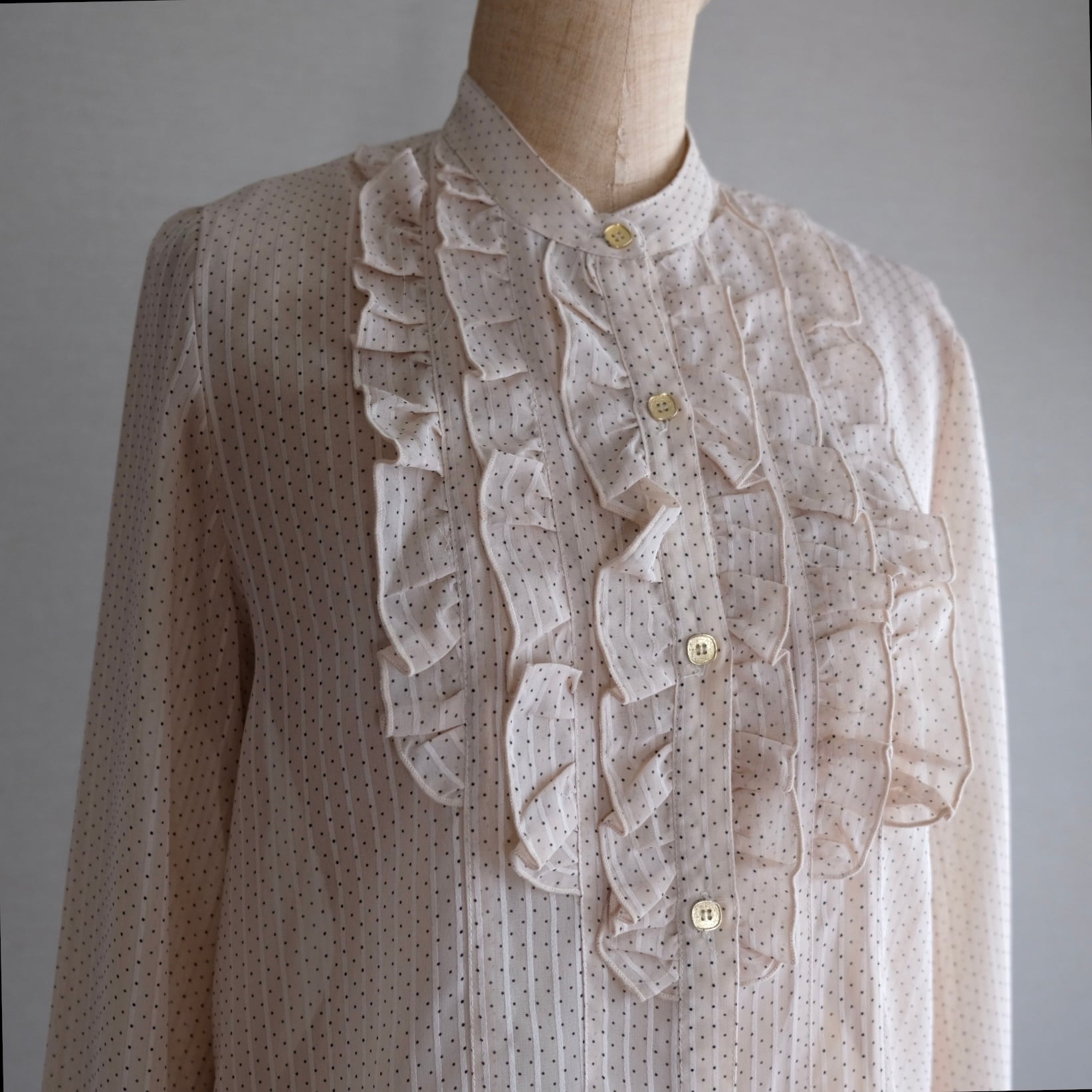 上品な透け感とピンドット&フリルデザインがすてきなブラウスです。ピンクがかった薄いベージュもエレガントです。