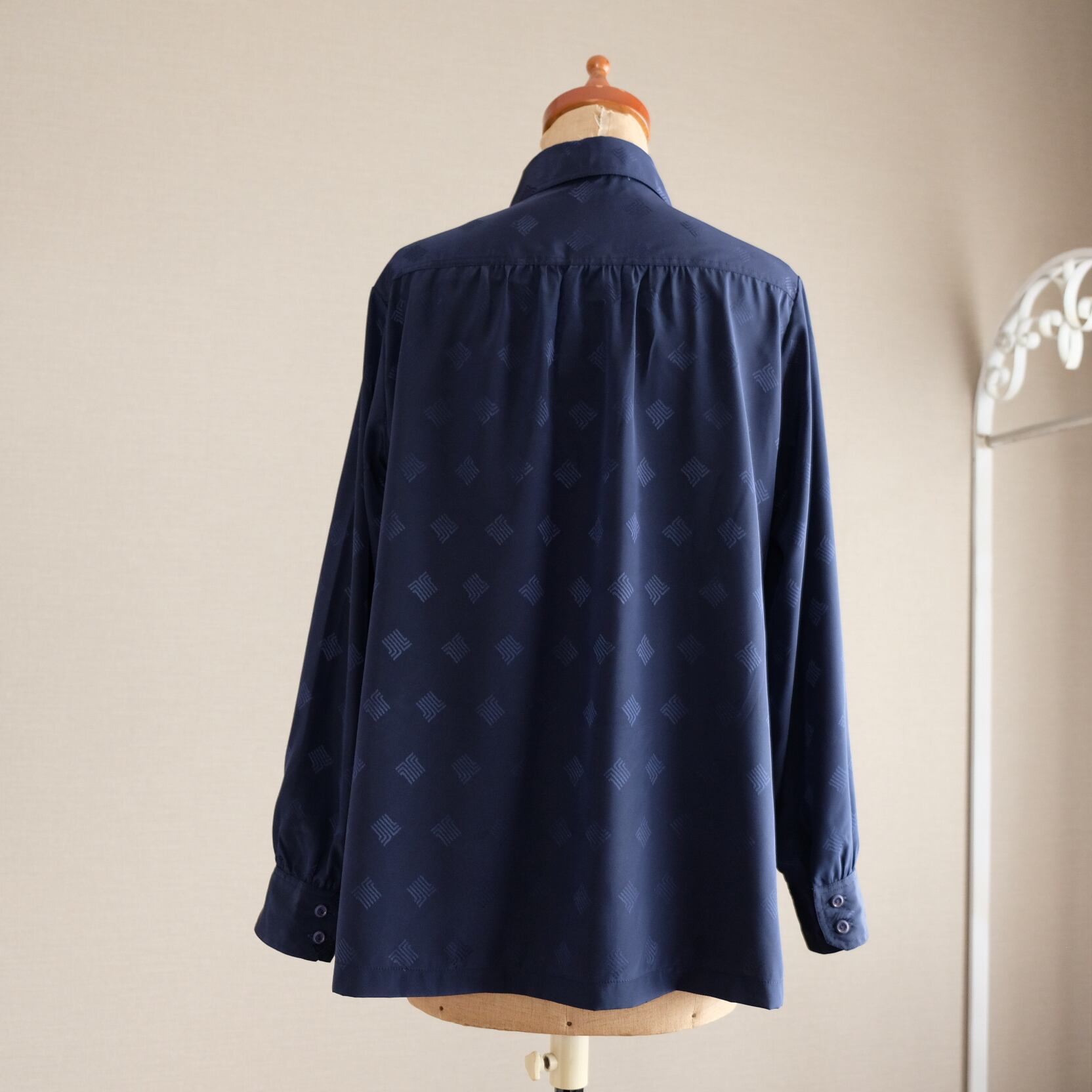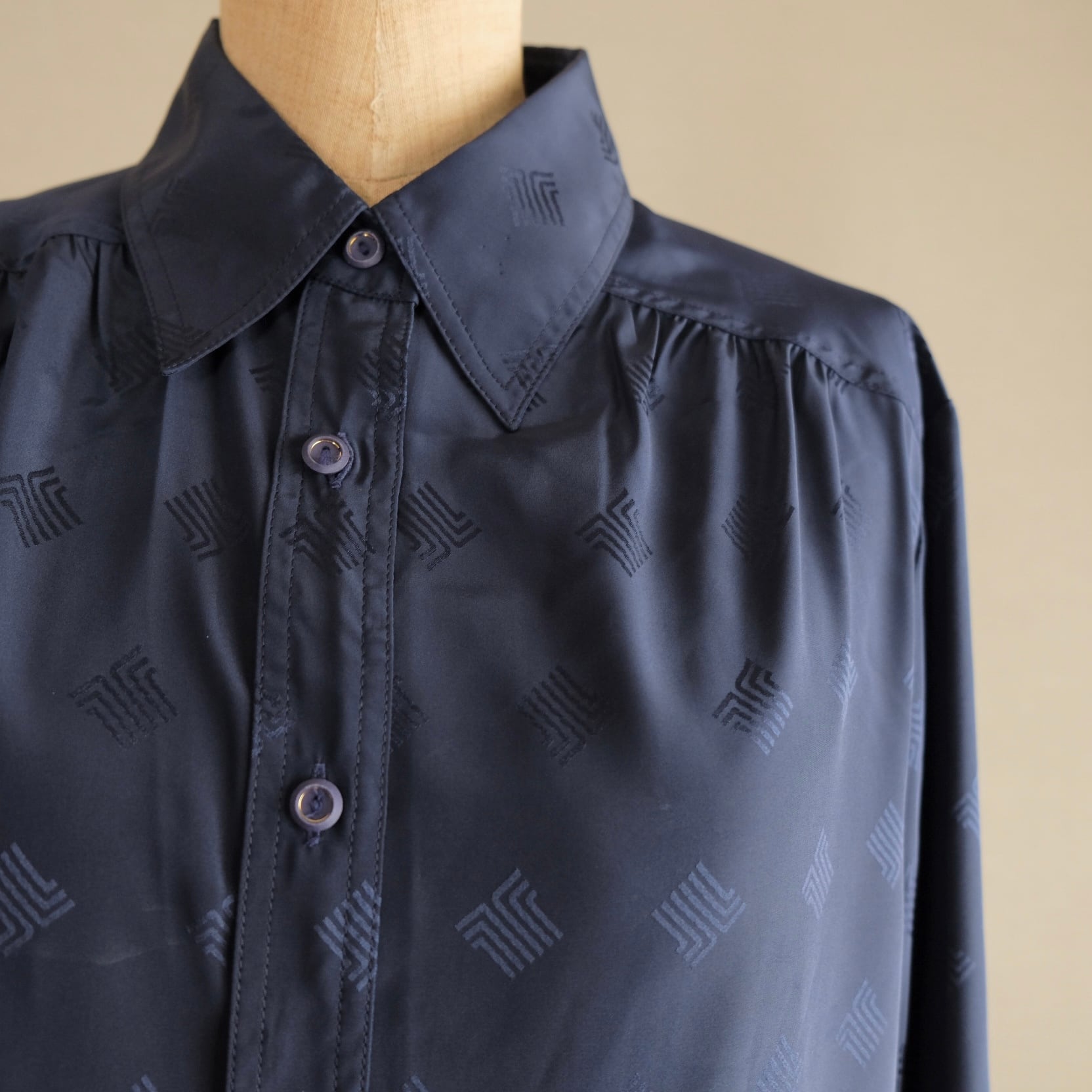 シンプルエレガントなミッドナイトブルー/ネイビーのブラウスです。やや光沢感のある生地と控えめな総柄、肩下のギャザーがすてきなお品です。