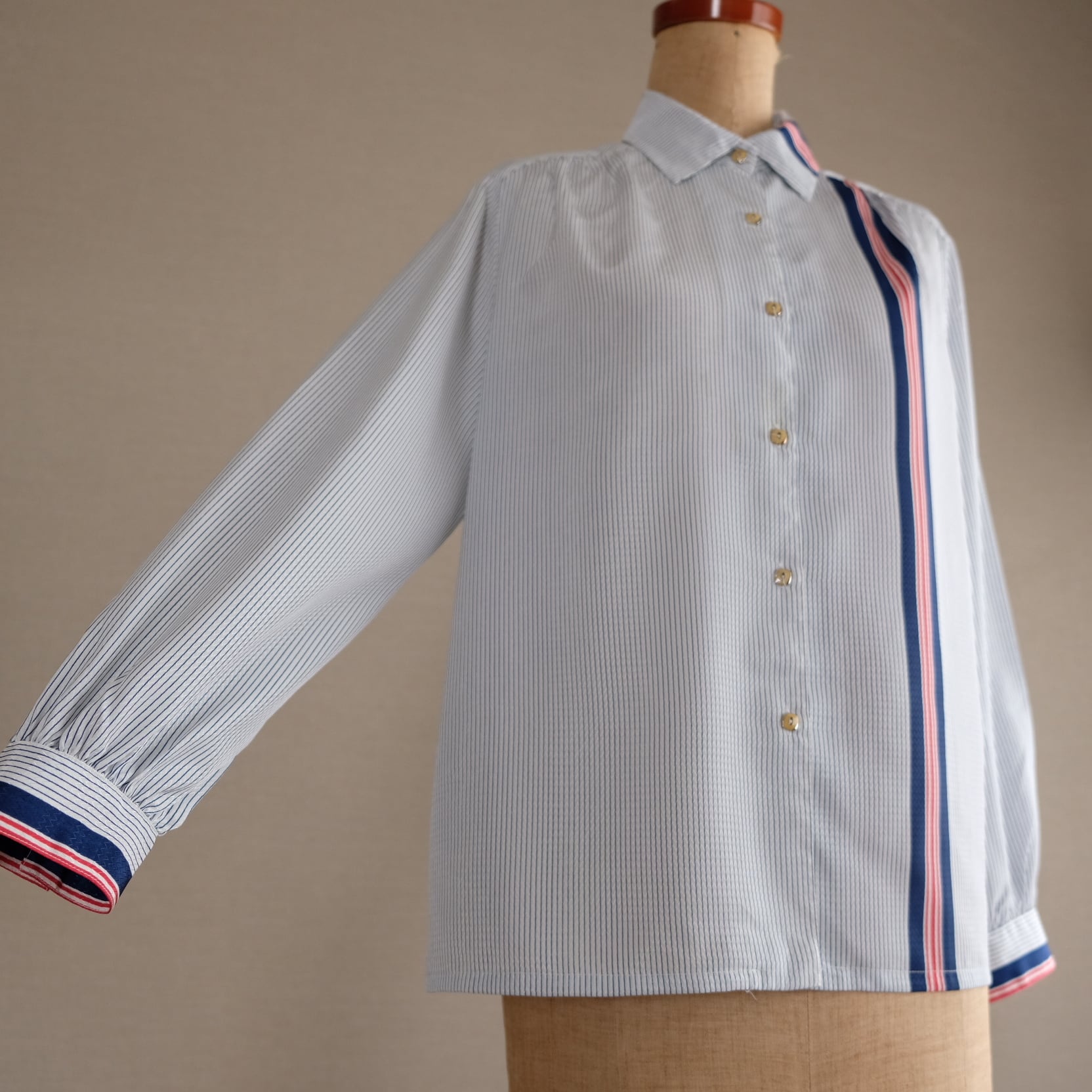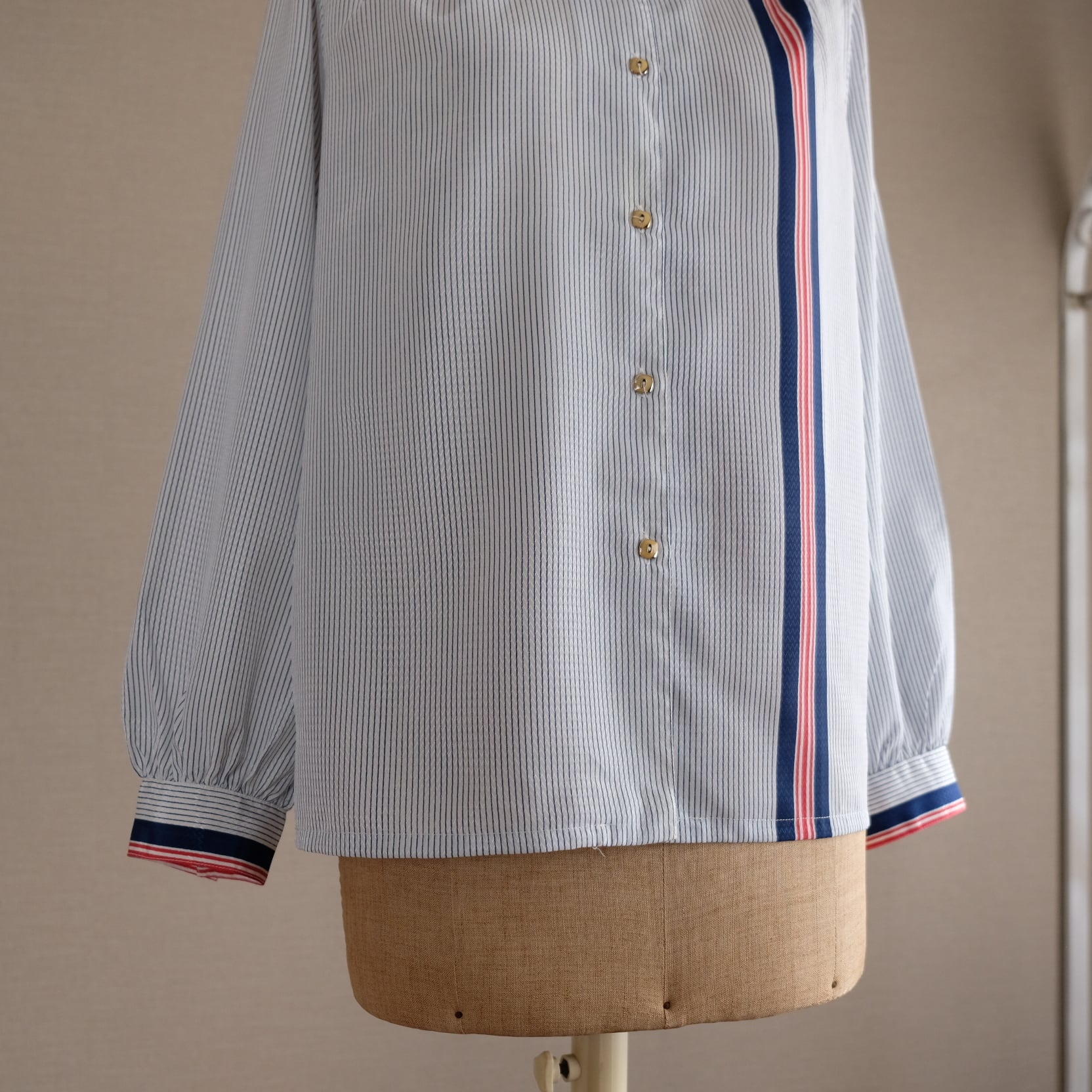 襟、袖、左側に入ったラインが入ったモダンデザインのブラウスです。レトロなマリンスタイルやトリコカラーのコーデにどうぞ❤︎