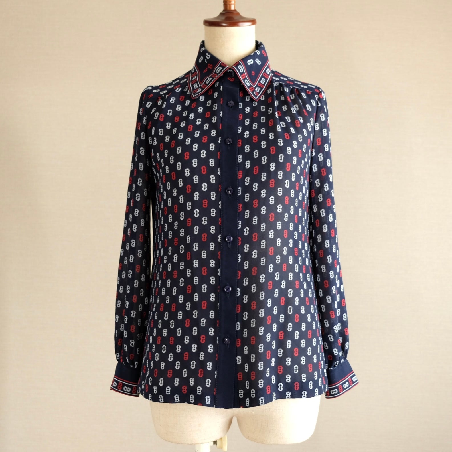 ネイビーベースのトリコカラー総柄がレトロでかわいいブラウスです。レトロマリンやトラッドスタイルに合わせやすそうなお品です。