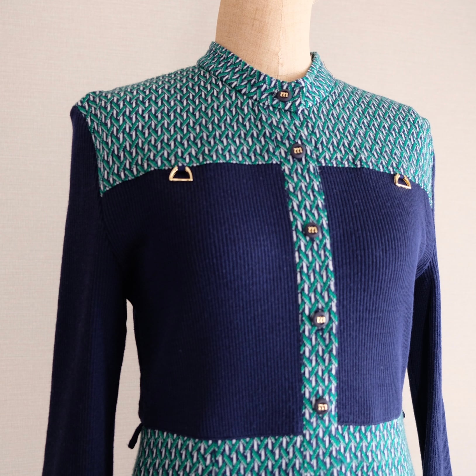 グリーン&ネイビーのバイカラーデザインがおしゃれなミスオンワードのワンピースです。ボタンや胸の飾り金具、詰まった襟のデザインもレトロですてきです。