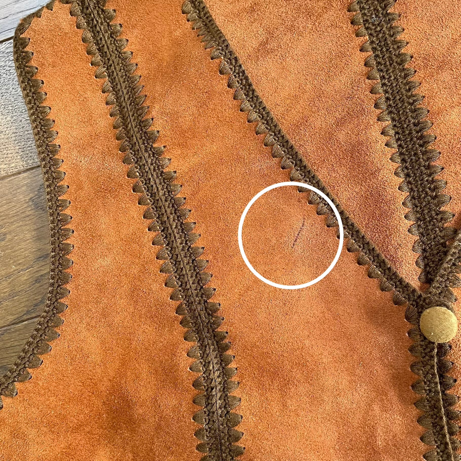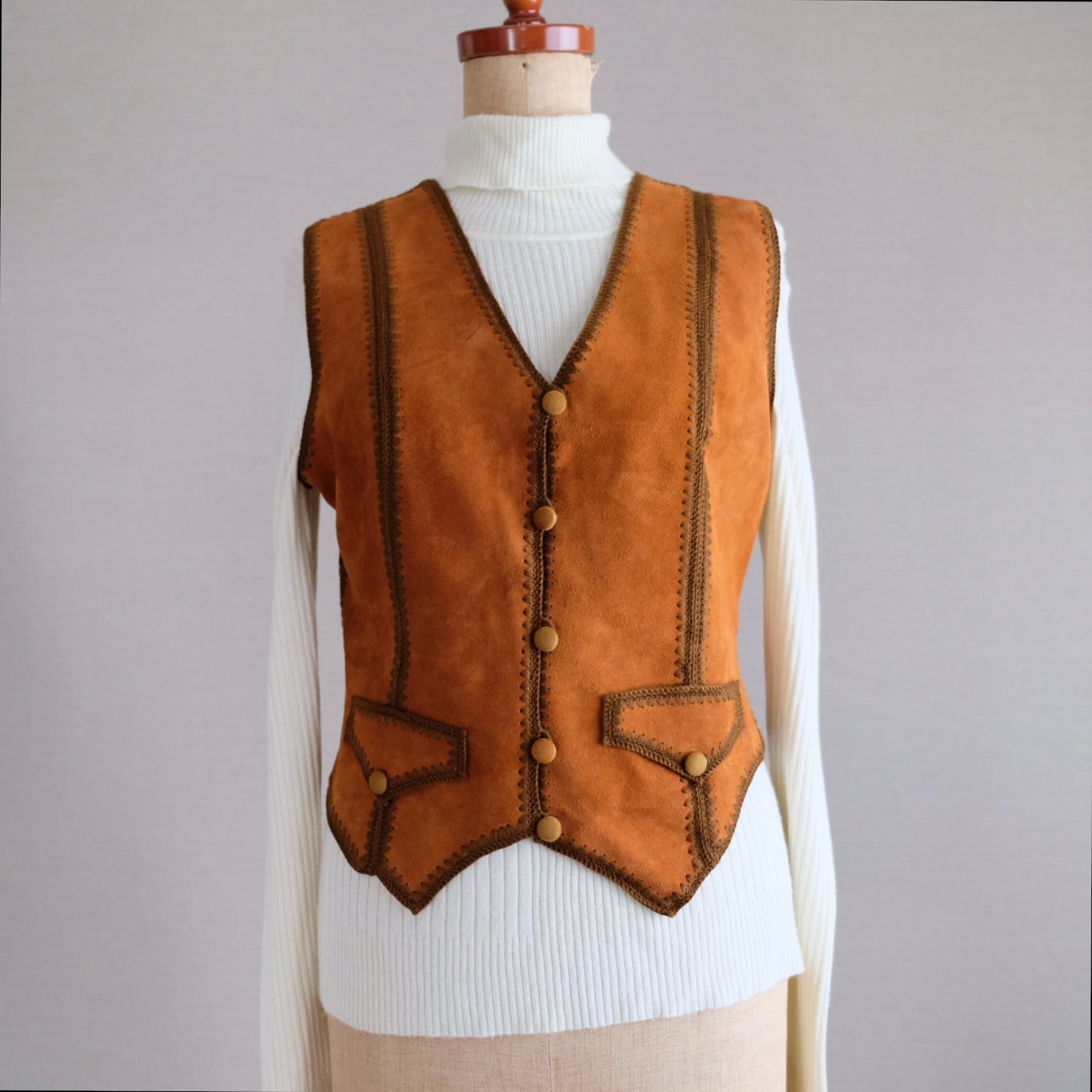 70s編み繋ぎのレザーベストです。これ一枚でグッと70年代な雰囲気アップ❤︎背中のデザインもナイス!着こなし次第で野良猫感も一流ブランド感も出せそうなマルチアイテムです。