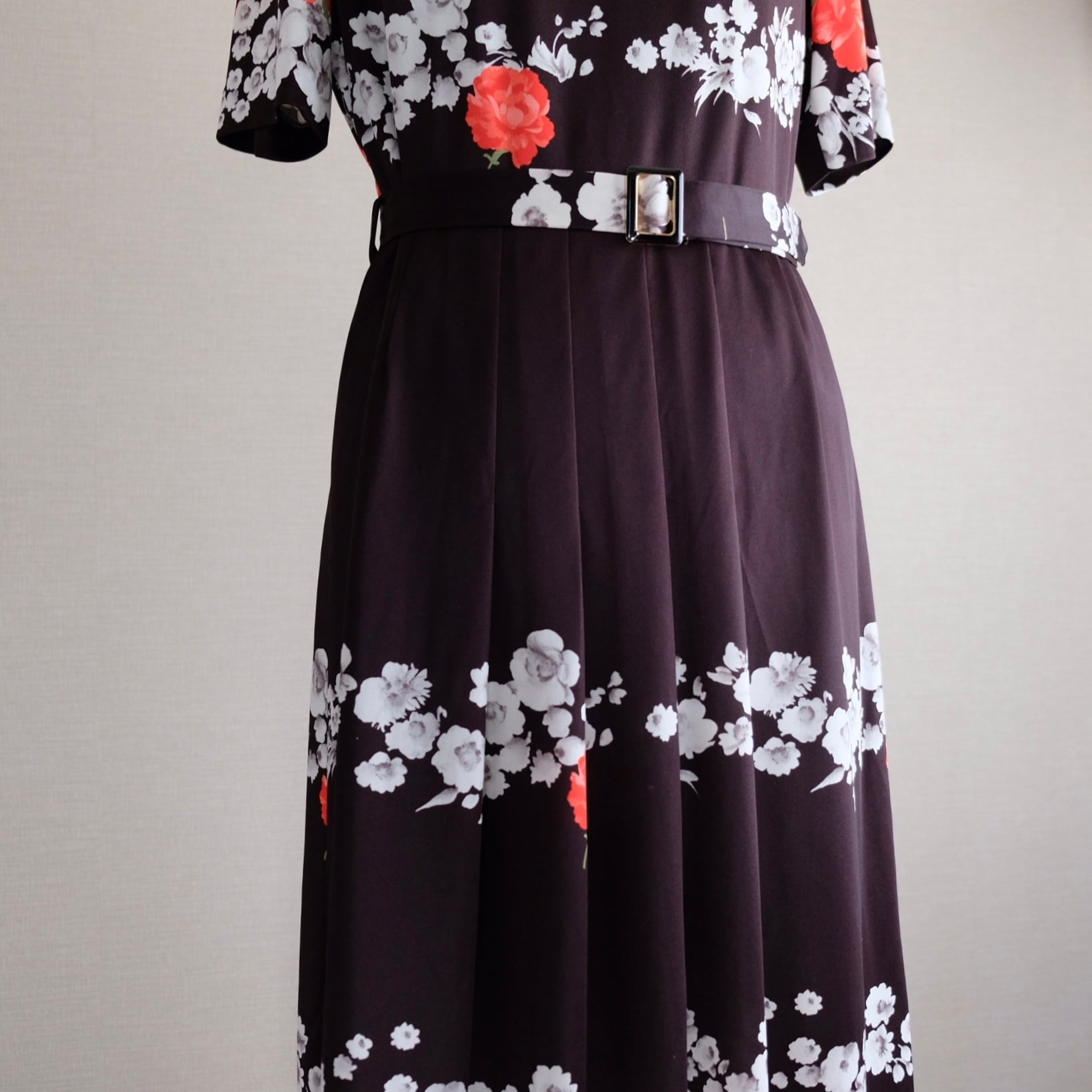 70s ブラック薔薇半袖ワンピース