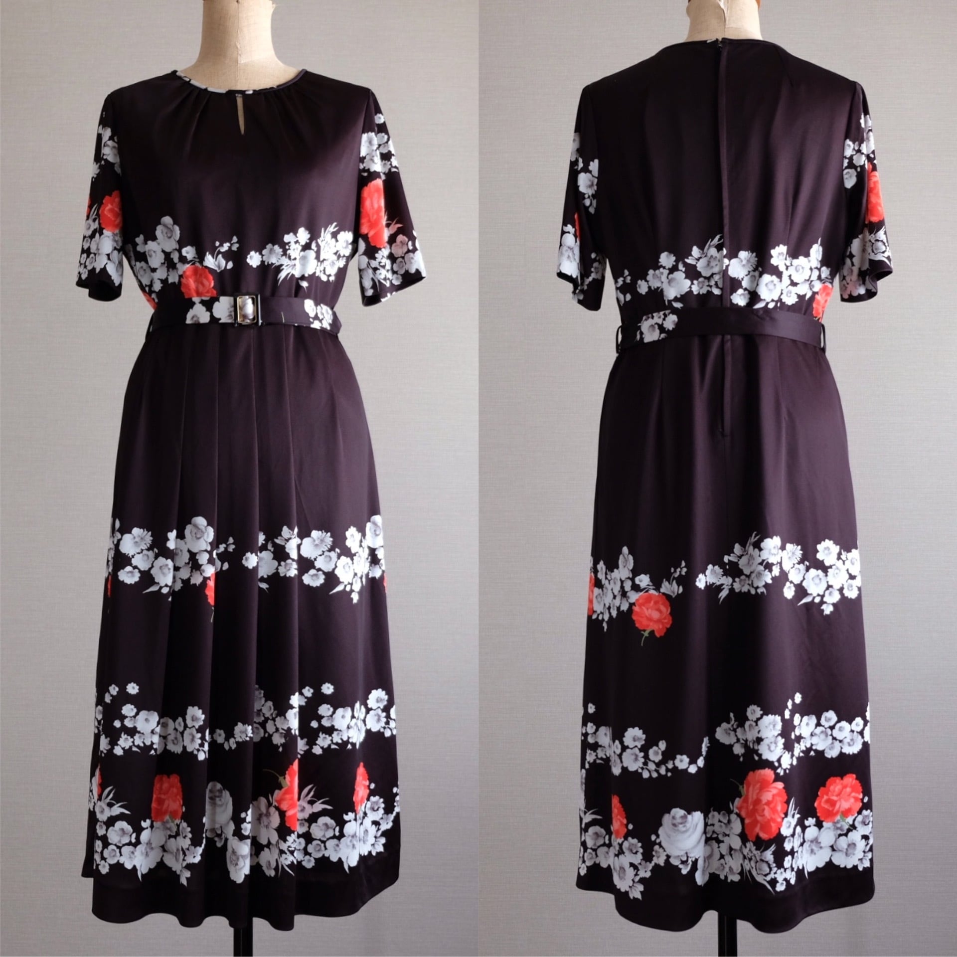 古着 70s ブラック薔薇半袖ワンピース