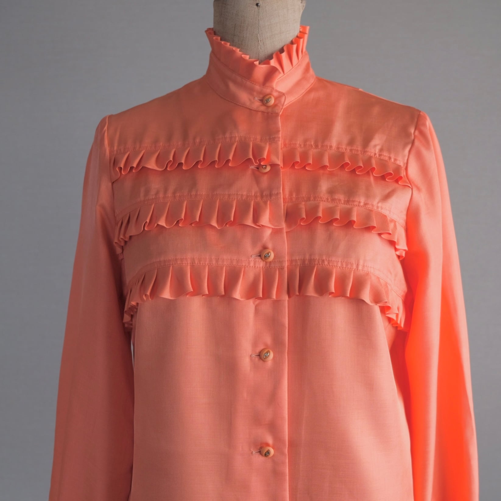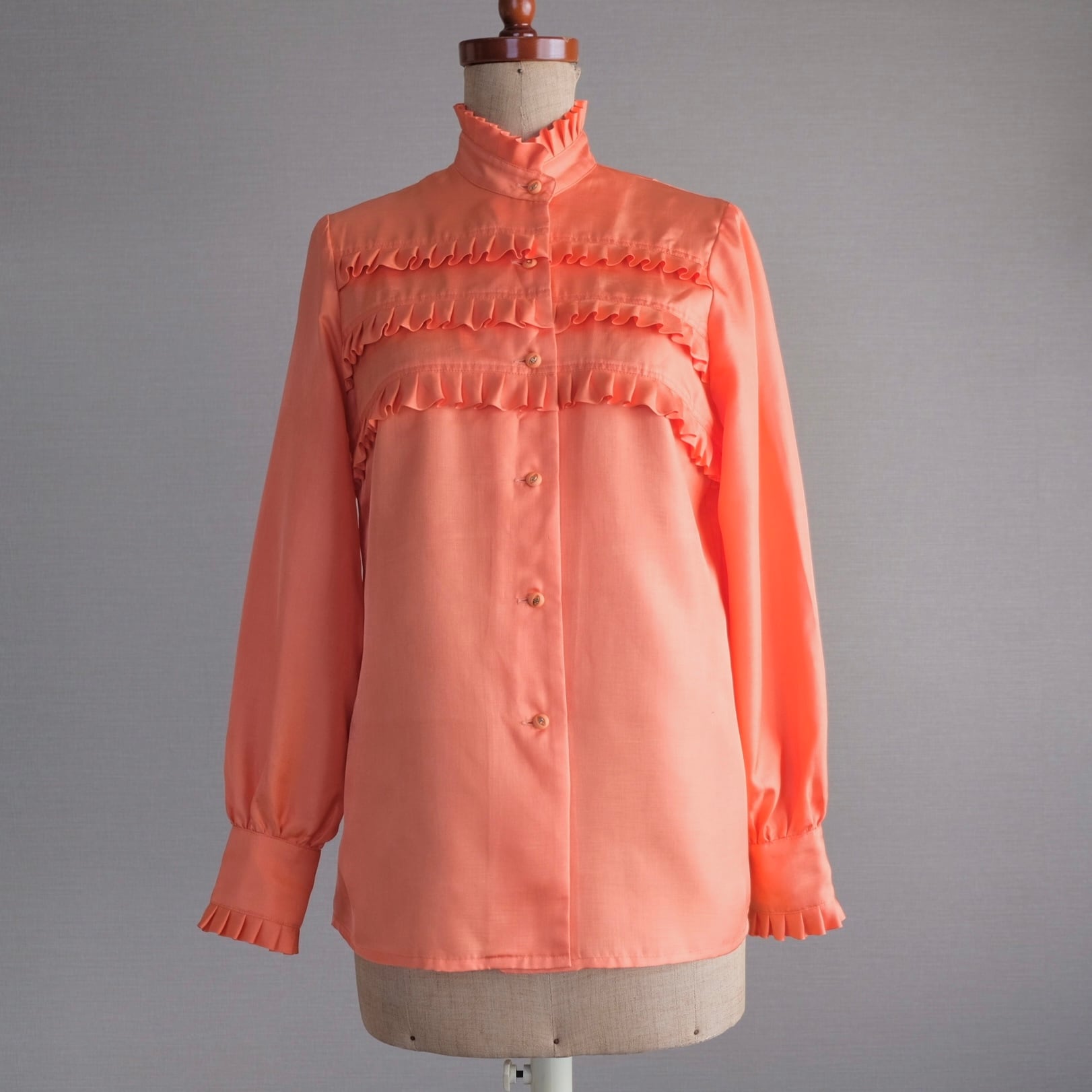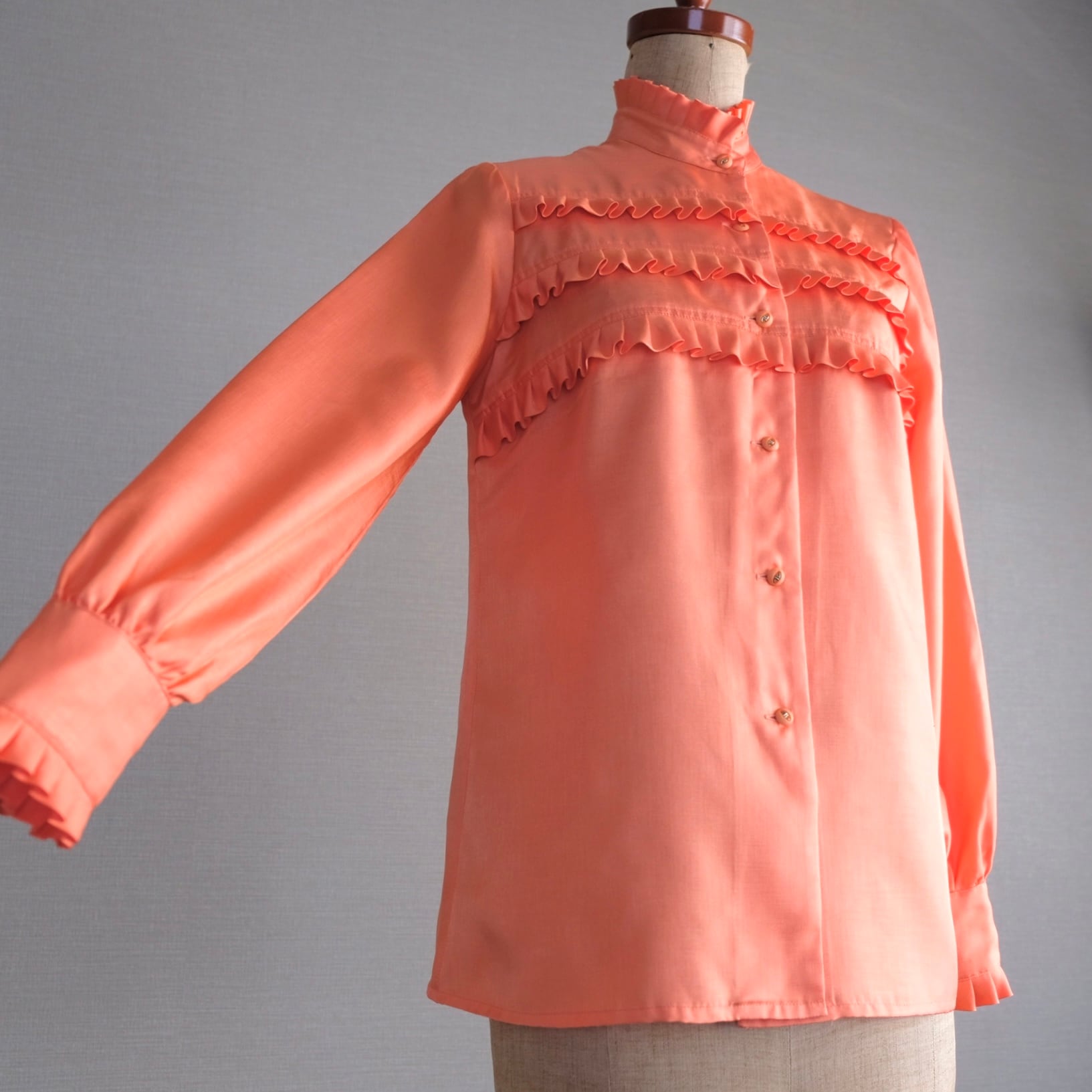 スタンドネックと胸元にふんだんにフリルがあしらわれたエレガントなブラウスです。オレンジ色はあまり見かけないレアカラーです。