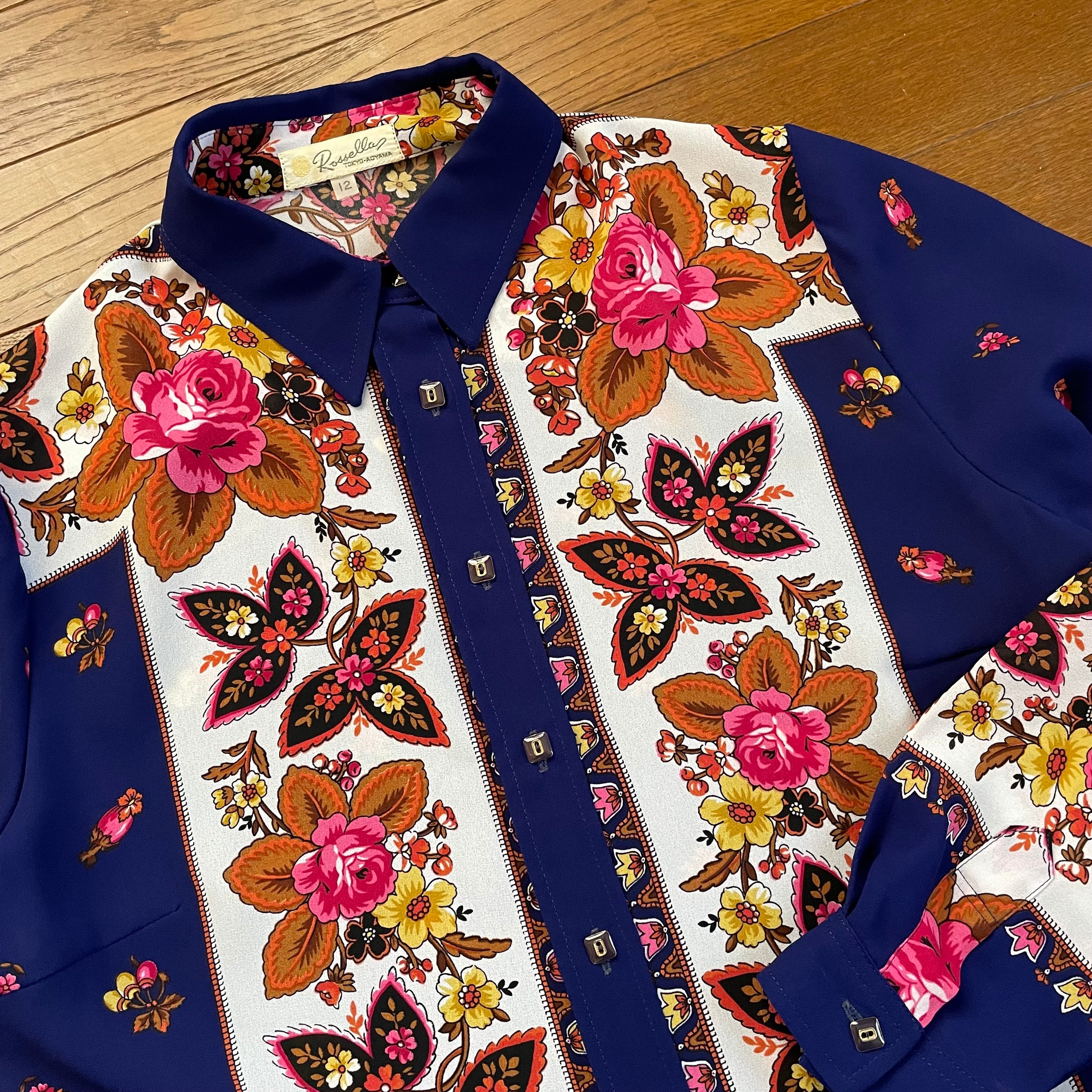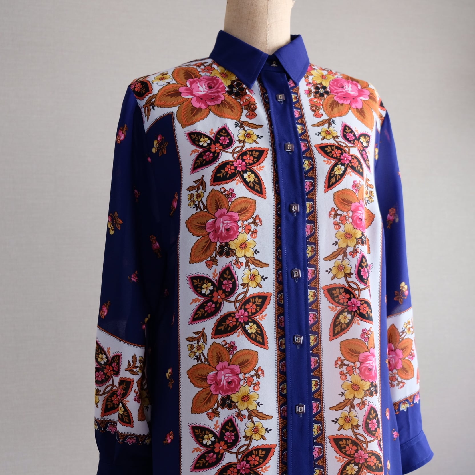 鮮やかなブルーとレトロな花柄がすてきなブラウスです。とても印象的なお品です。