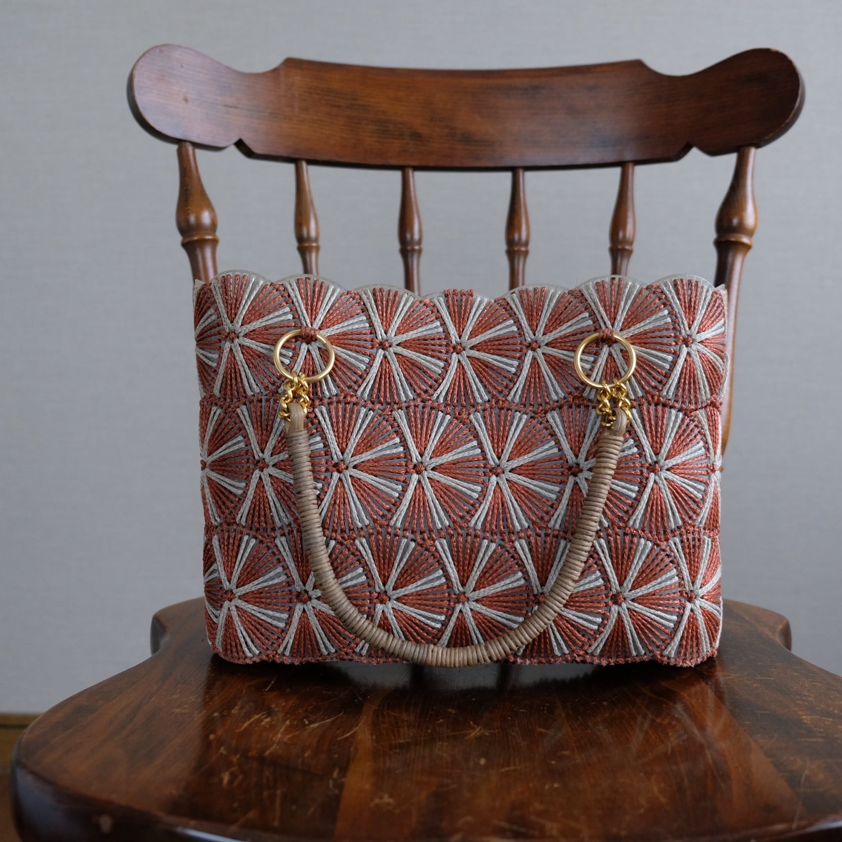 サークル模様と渋めの配色がかわいい編みバッグです。レトロ感いっぱいのお品です。