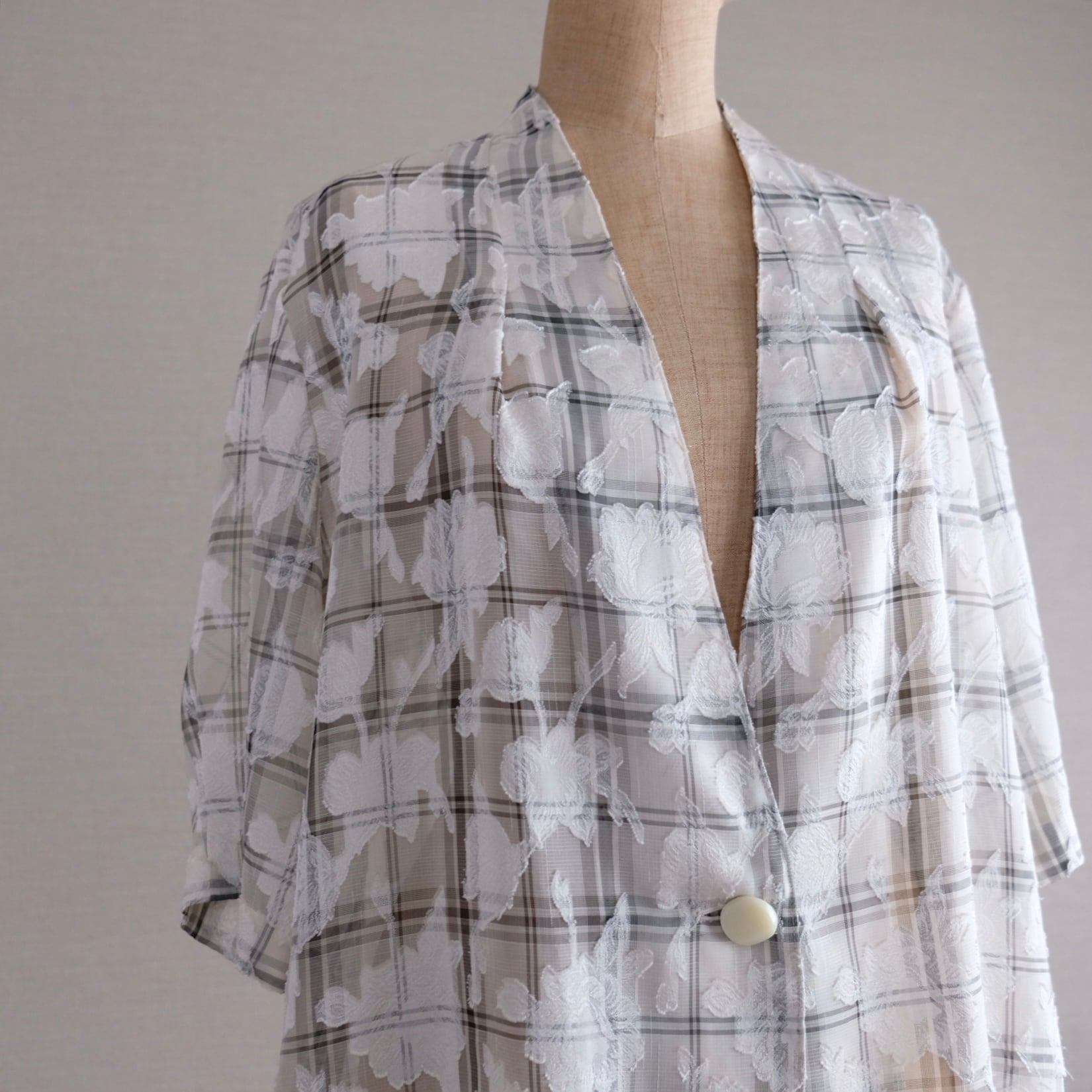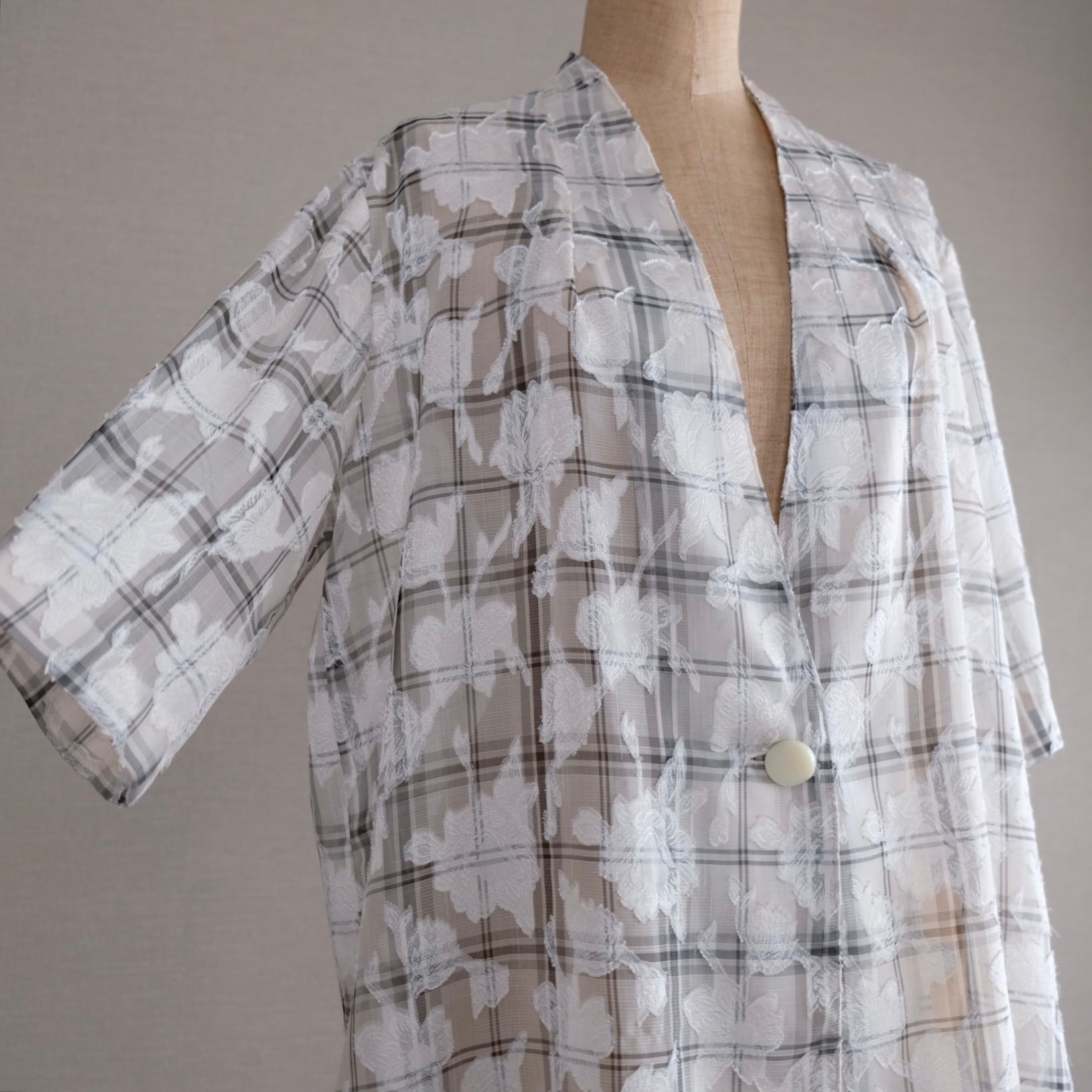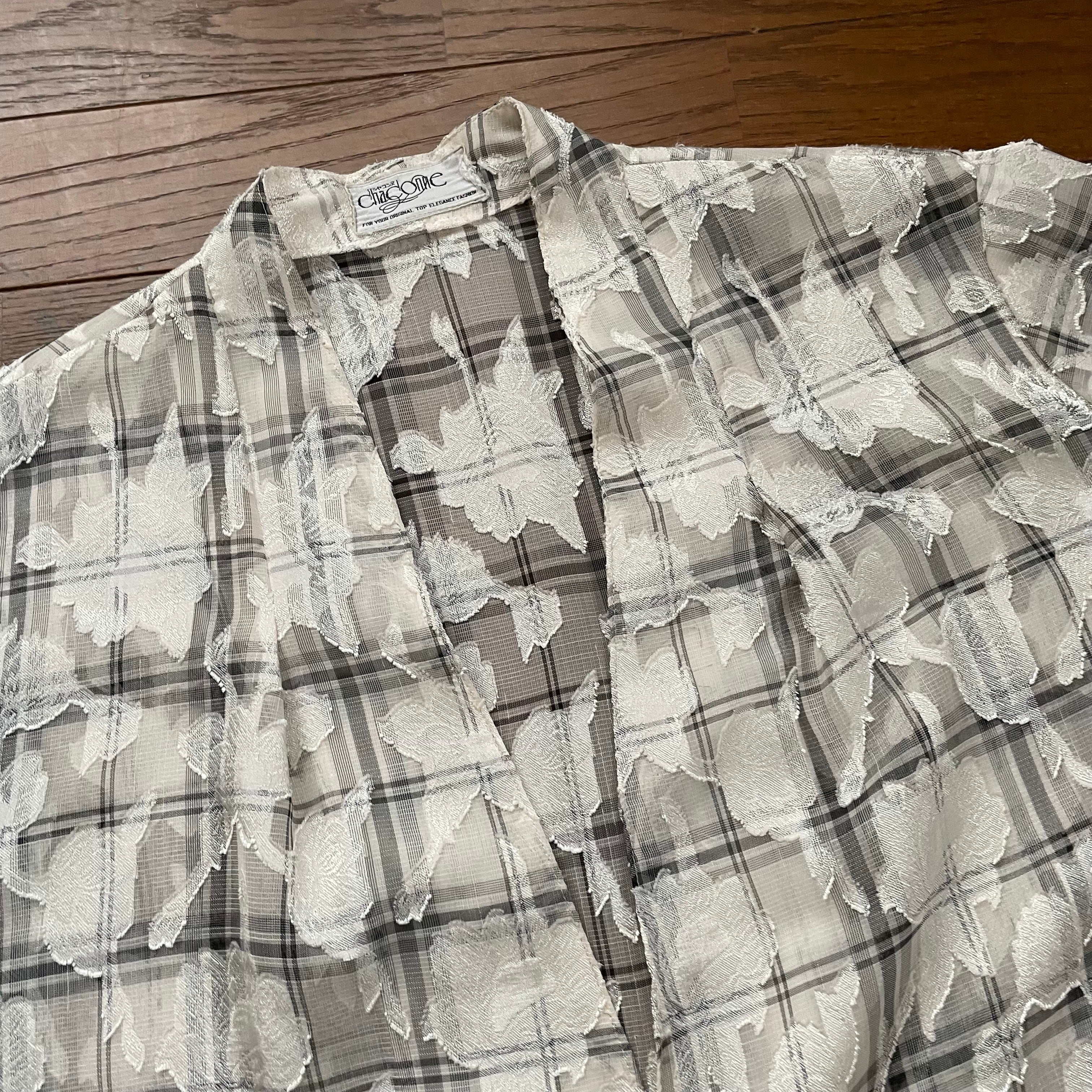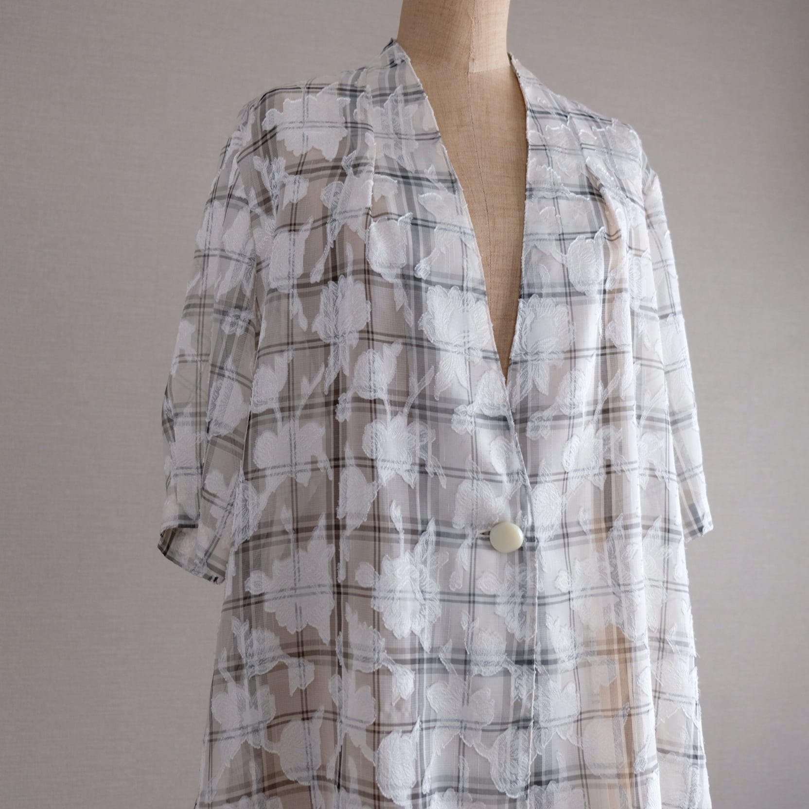 チェック&フラワーレースのサマージャケットです。ゆったりめのサイズ感でこれからの季節の日除け、冷房対策の羽織として活躍してくれそうなお品です。