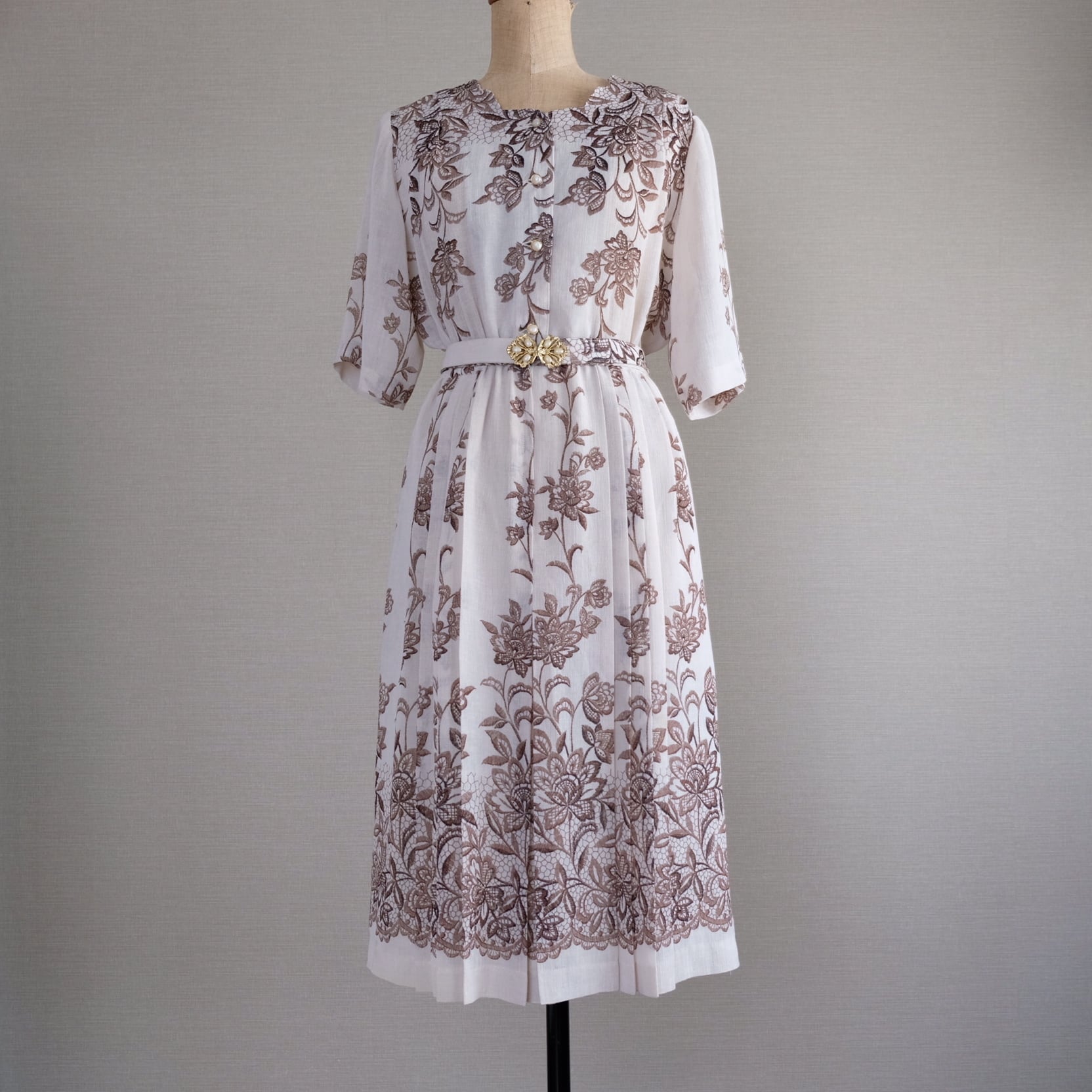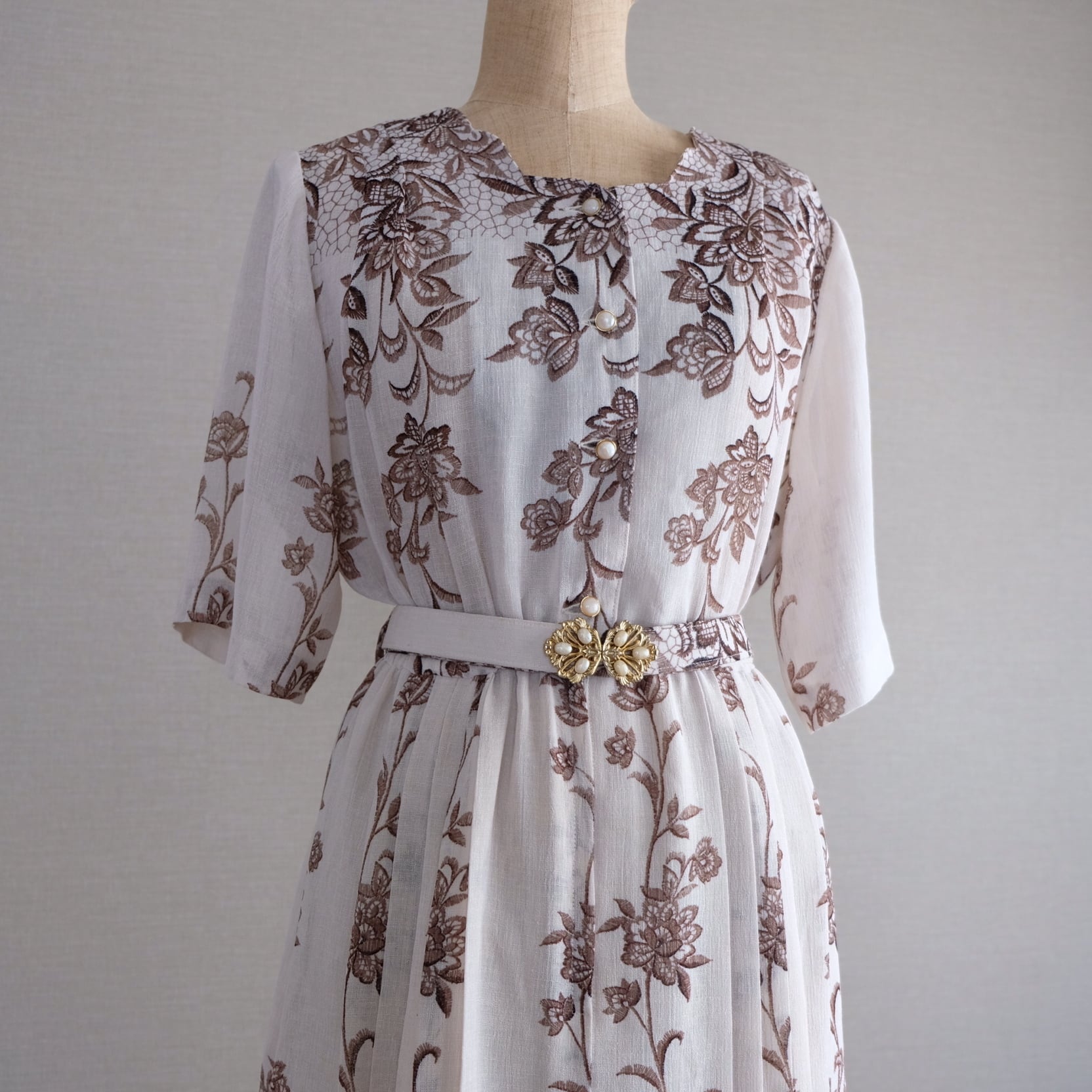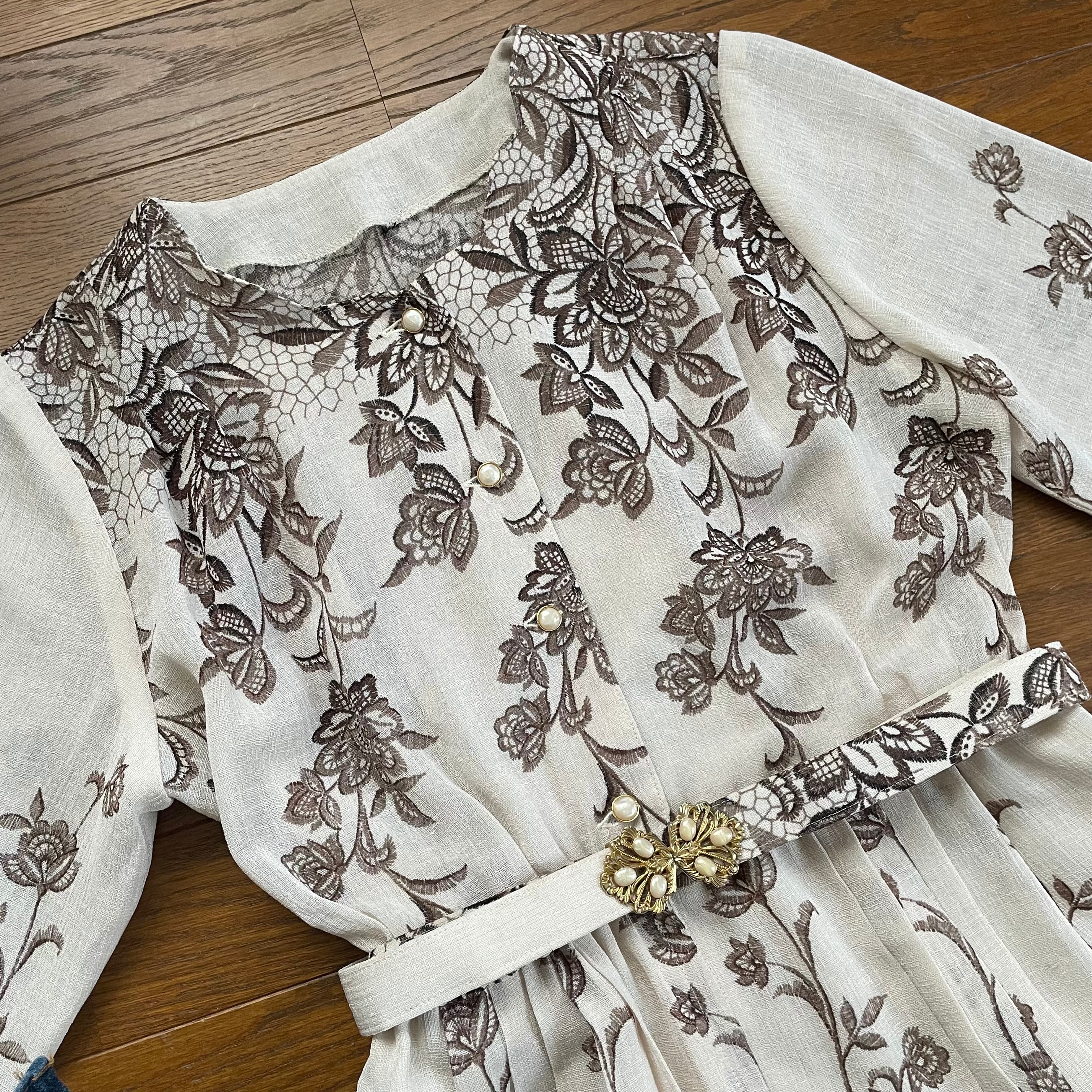 レトロな刺繍レース風プリントがエレガントなワンピースです。共布のベルト付きです。