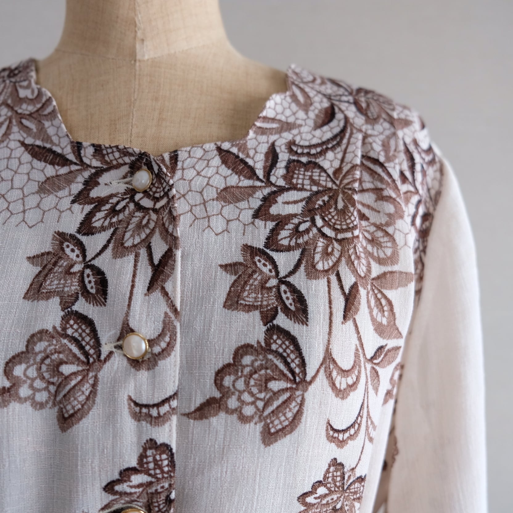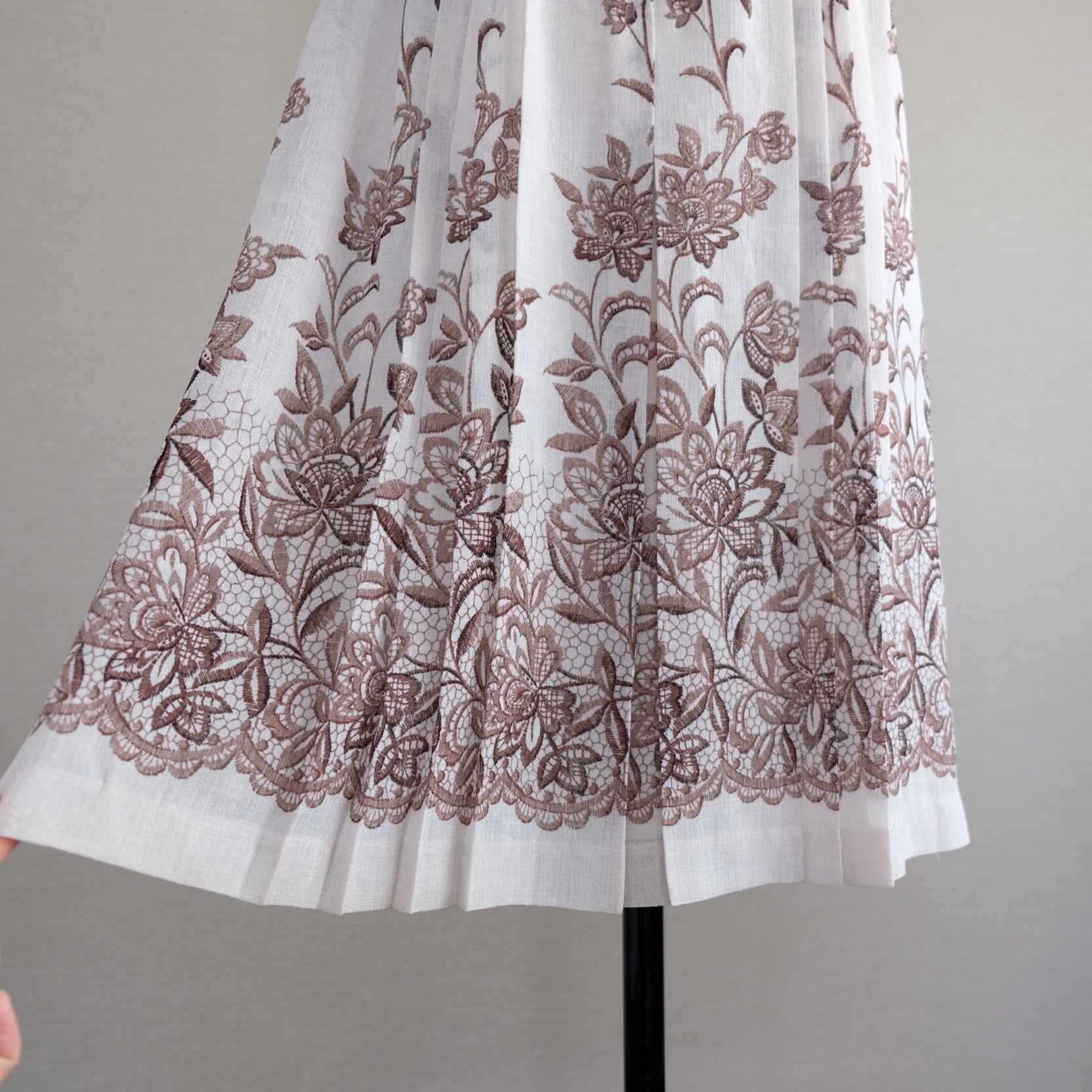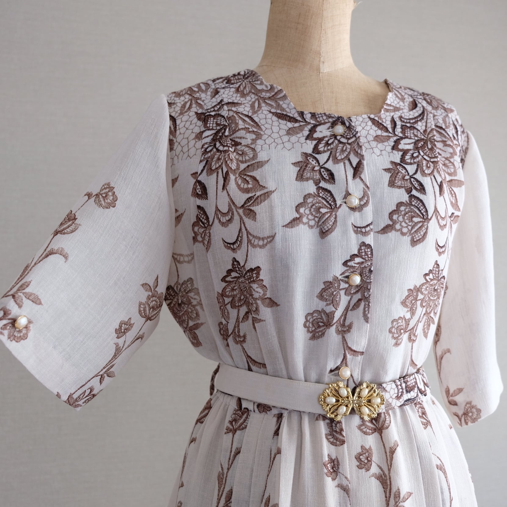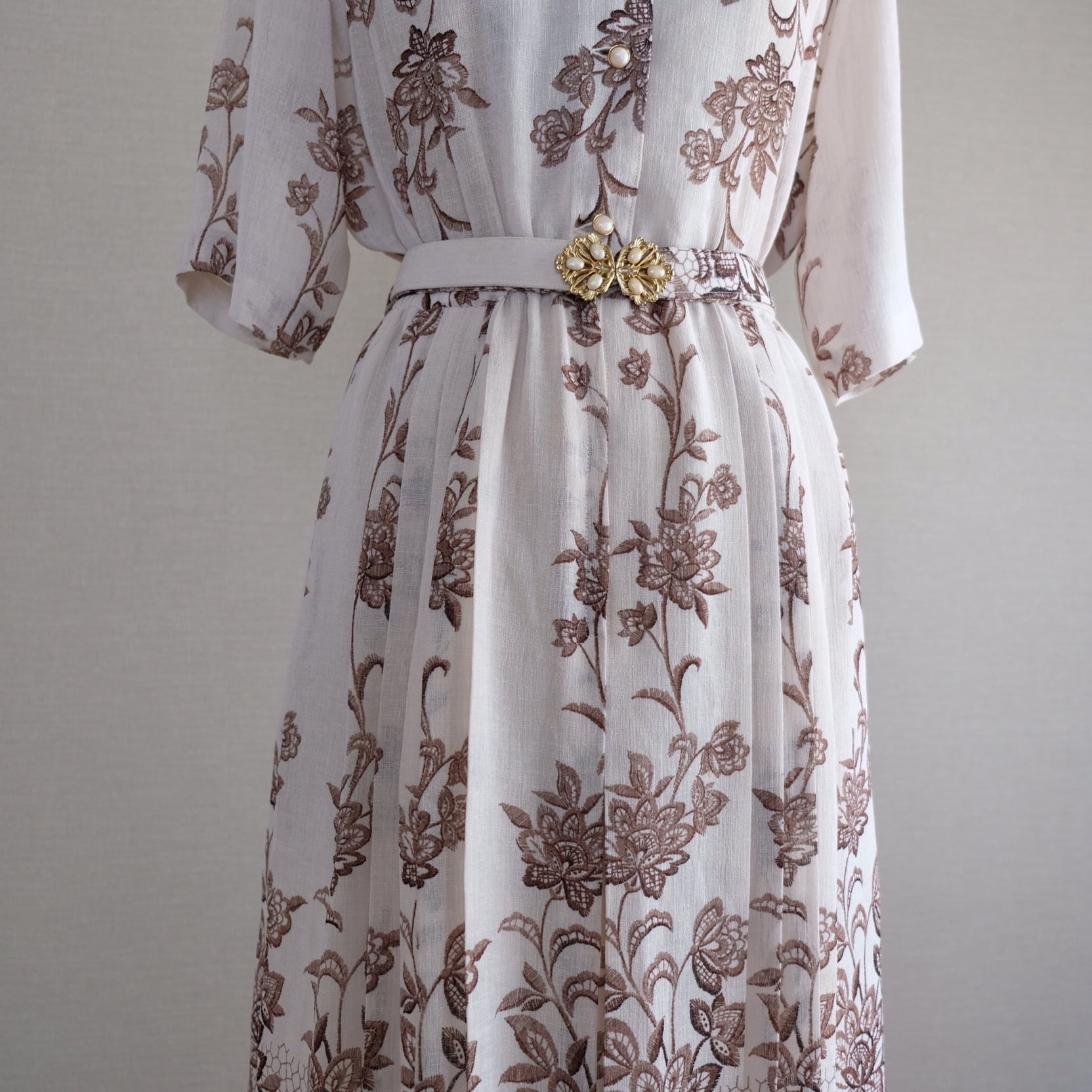 レトロな刺繍レース風プリントがエレガントなワンピースです。共布のベルト付きです。