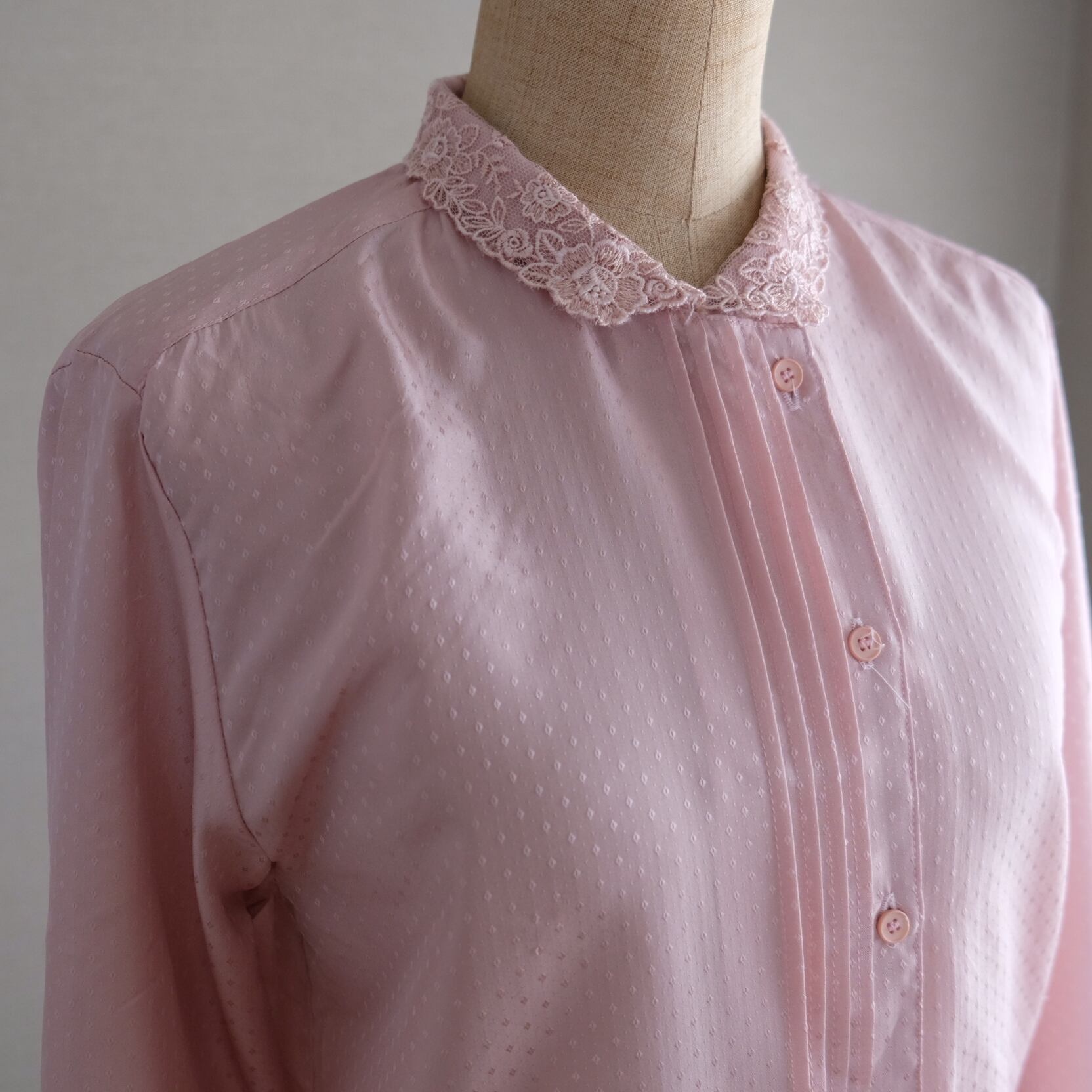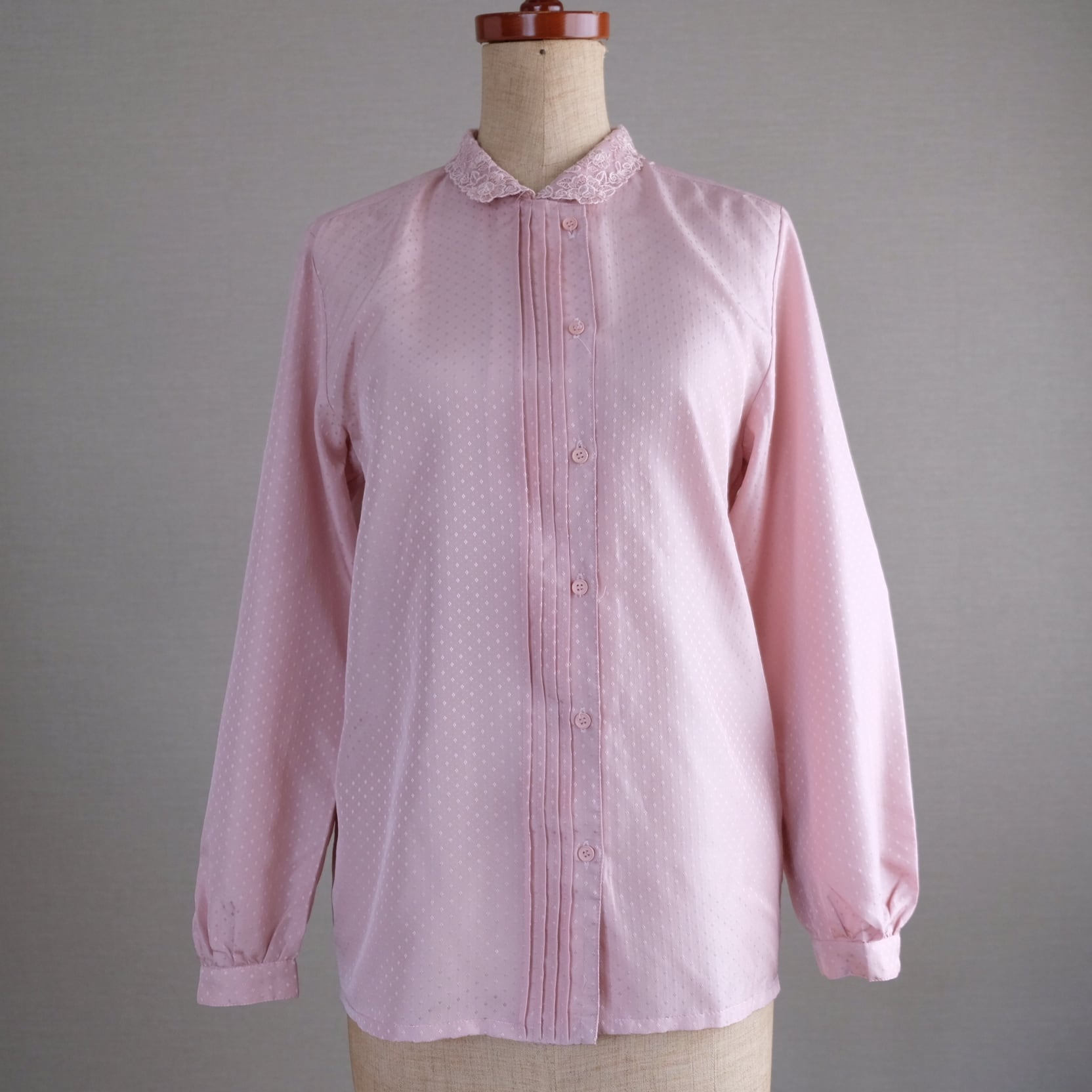 小さめのレース襟とくすんだピンク色がチャーミングな長袖ブラウスです。アシンメトリーに配置されたボタンやセンターに入ったラインもレトロで素敵です。