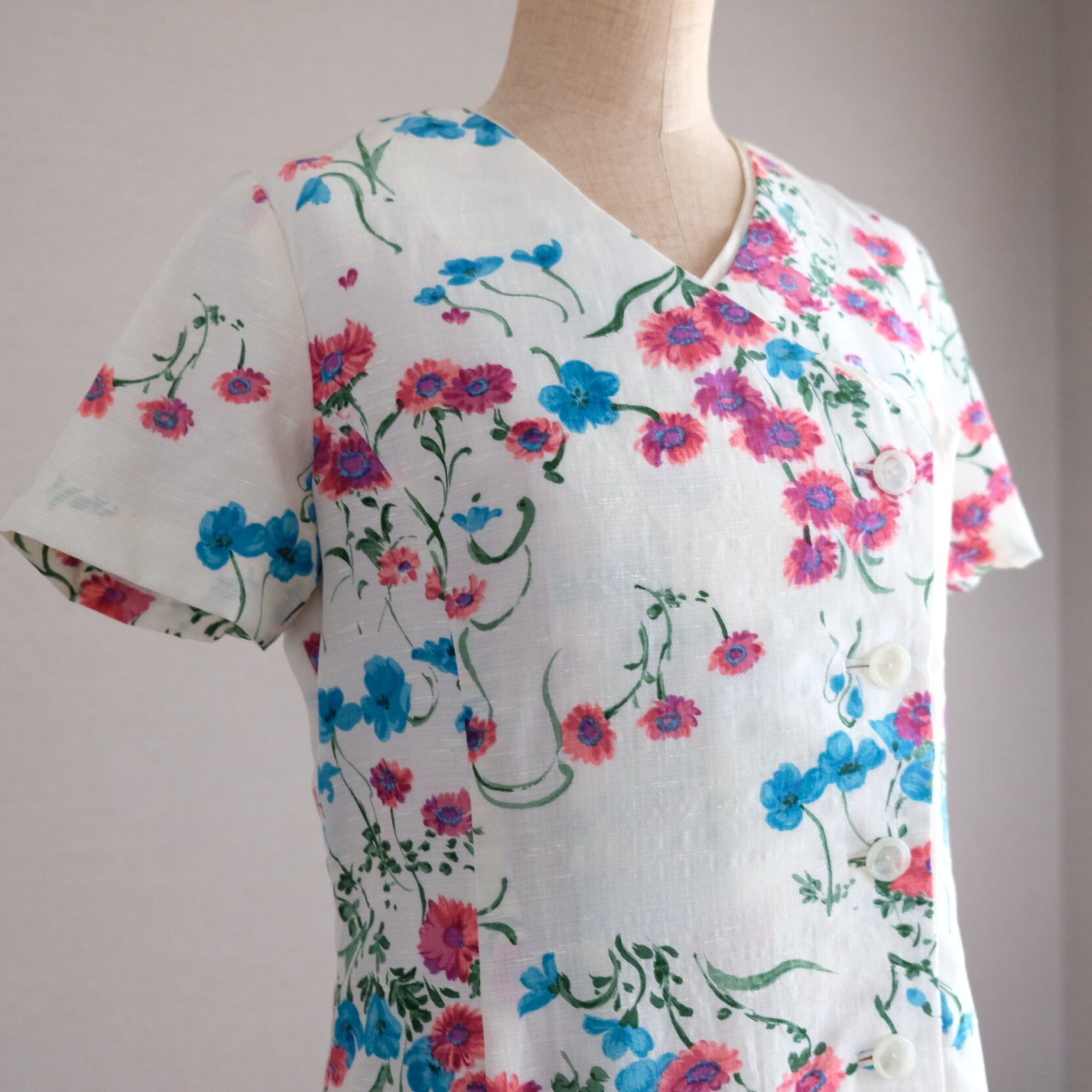 白地にピンクとブルーの花模様があしらわれた美しい半袖ワンピースです。アシンメトリーなデザインもすてきです。