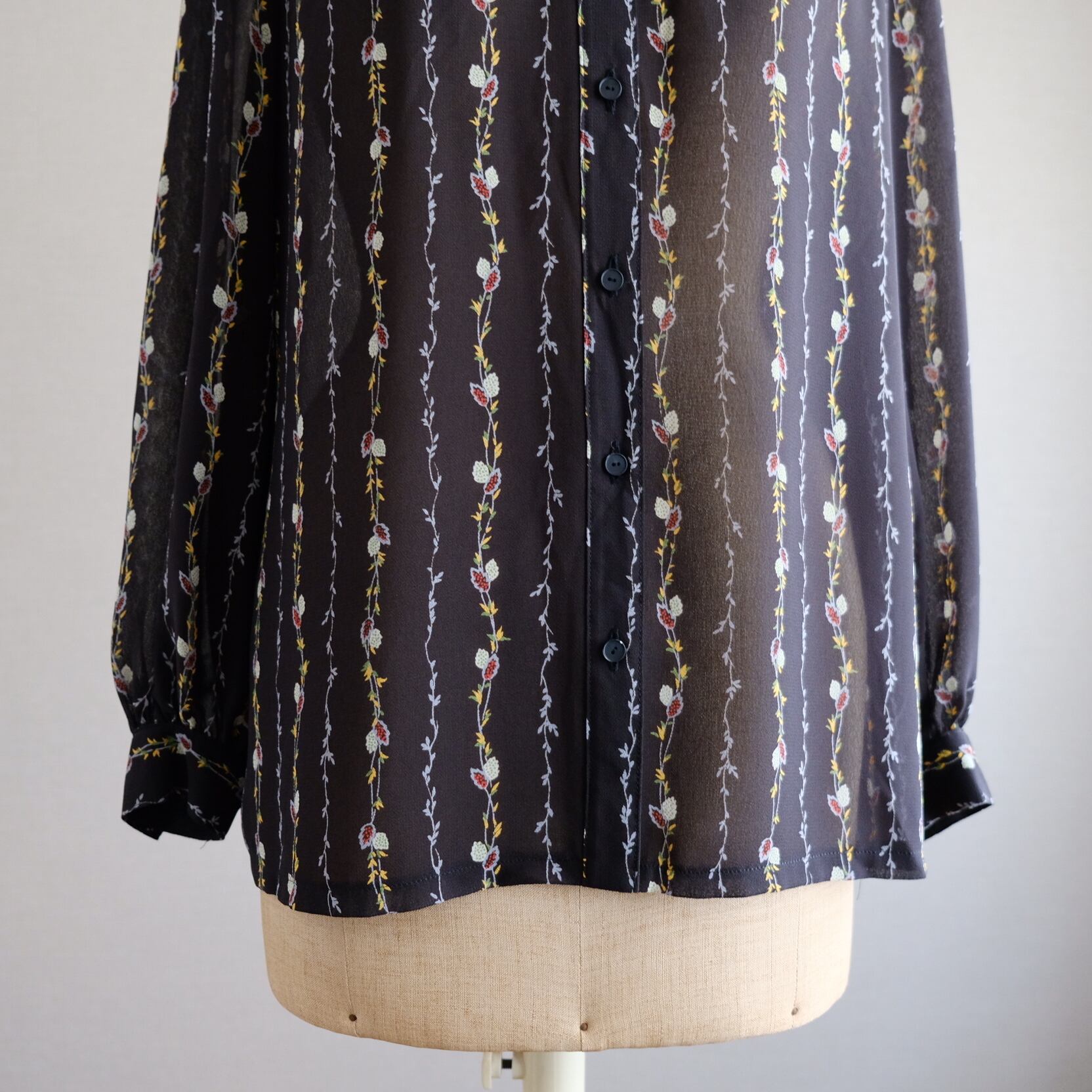 おしゃれな葉っぱ柄がすてきな長袖ブラウスです。スーツやジャケットのインナーに、ブラックパンツに、どんなアイテムとも合わせやすそうなお品です。