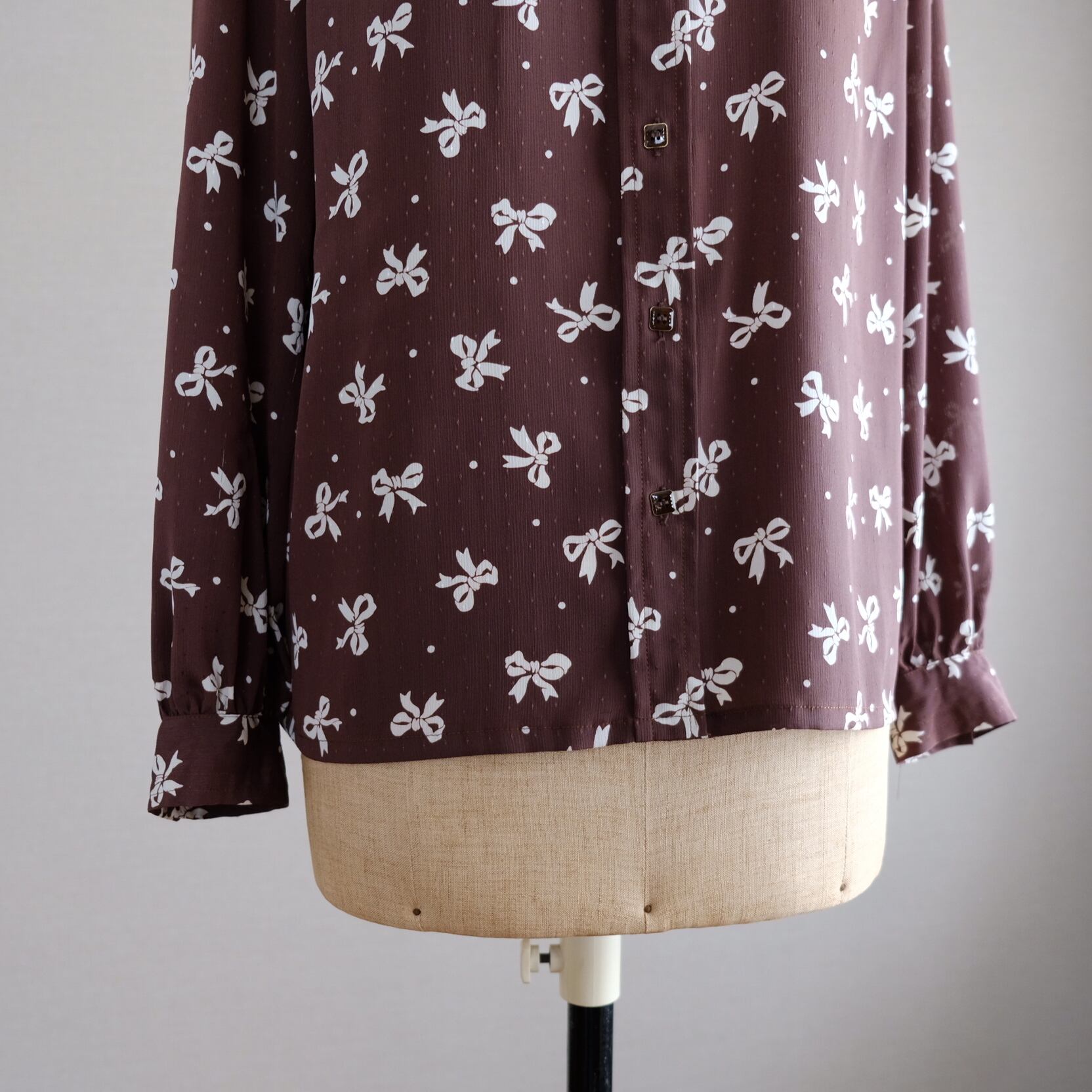 リボンの模様がチャーミングな長袖ブラウスです。ブラウンの色合いもいい感じです。