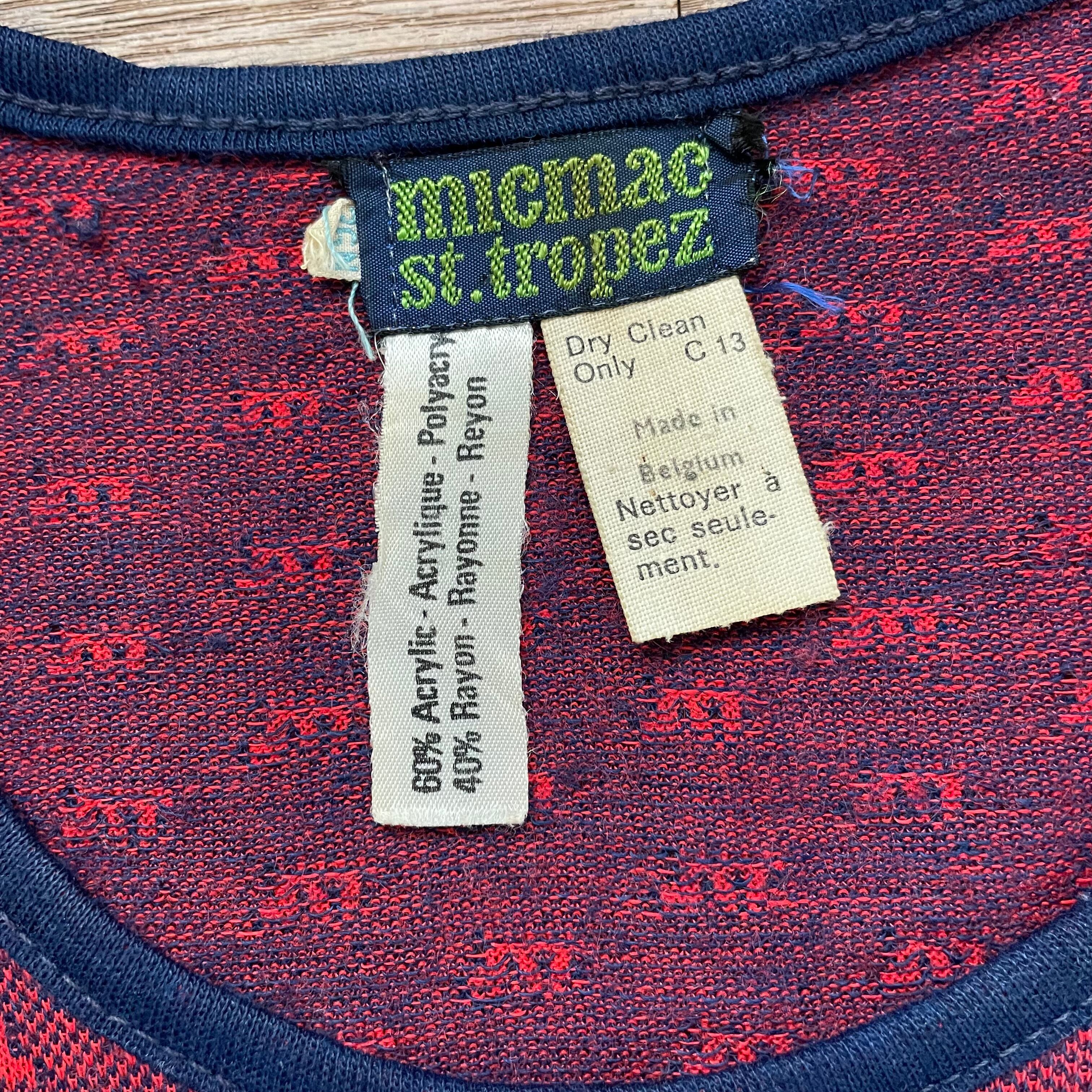 タイトな細長シルエット&赤青カラーがレトロなニットトップスです。ブランドのモノグラム?のような模様とラインもすてきです。