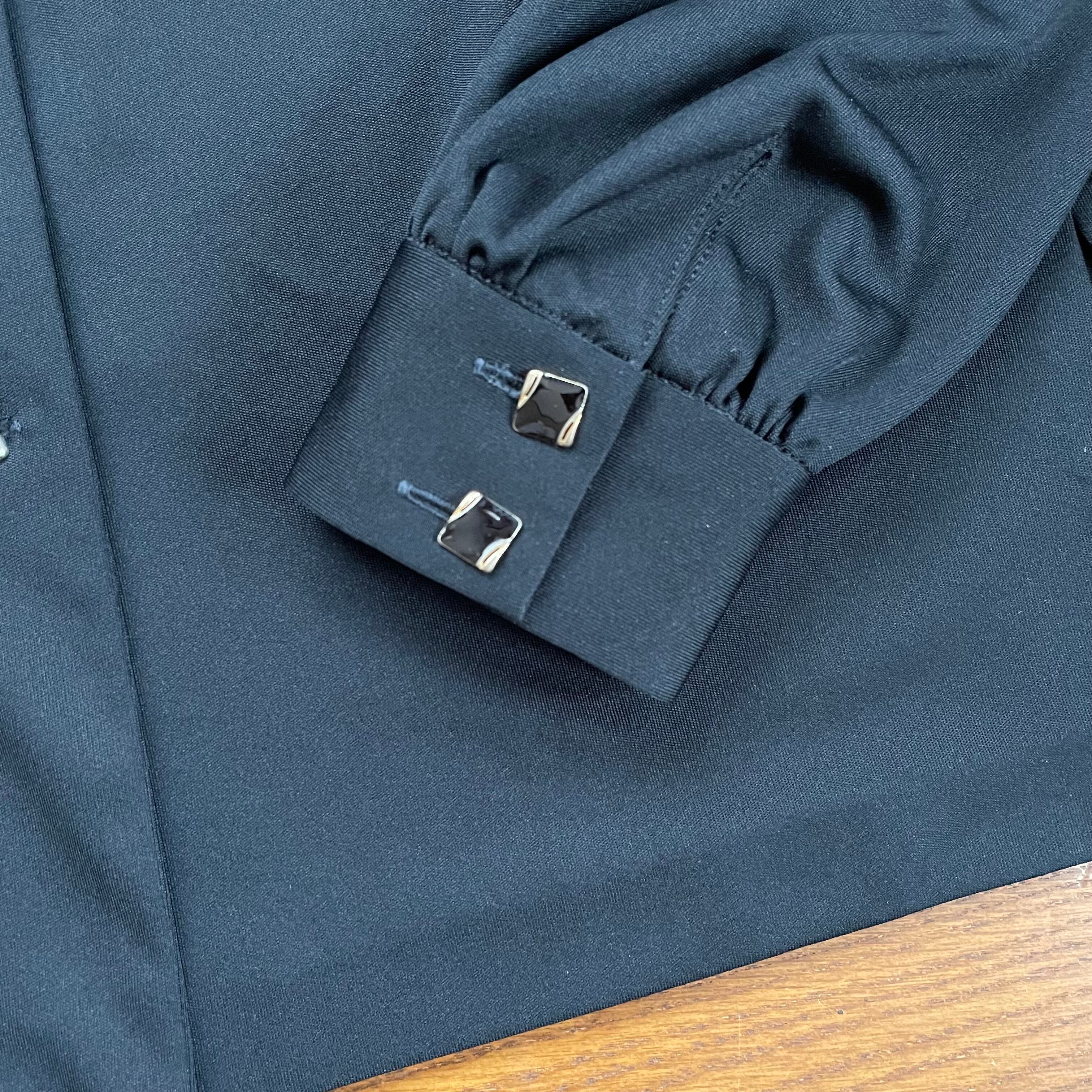 大きな襟とタイトなシルエットがすてきな70sブラウスです。エレガントな肩レースと光沢感ある生地がお洒落なお品です。サイドにスリットあり。