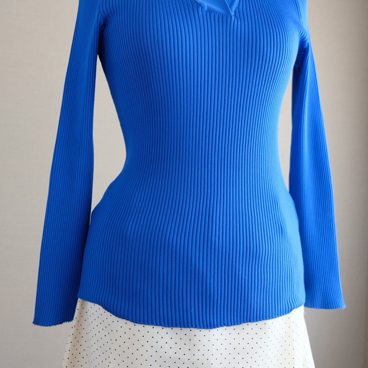 大きな襟とリブ編みがレトロなトップスです。鮮やかなブルーもすてきです。