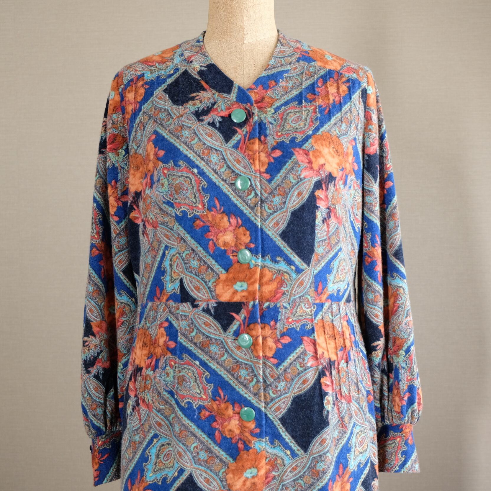 レトロな総柄がおしゃれなワンピースです。やや起毛したネルのようなふわっとした生地で、真冬も暖かそうです。